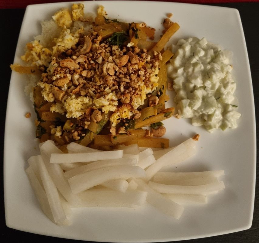 Rettich met spinazie, cashewnoten en roerei met Rettich salade. Alleen bietenstelen, beetje waterspinazie uet.