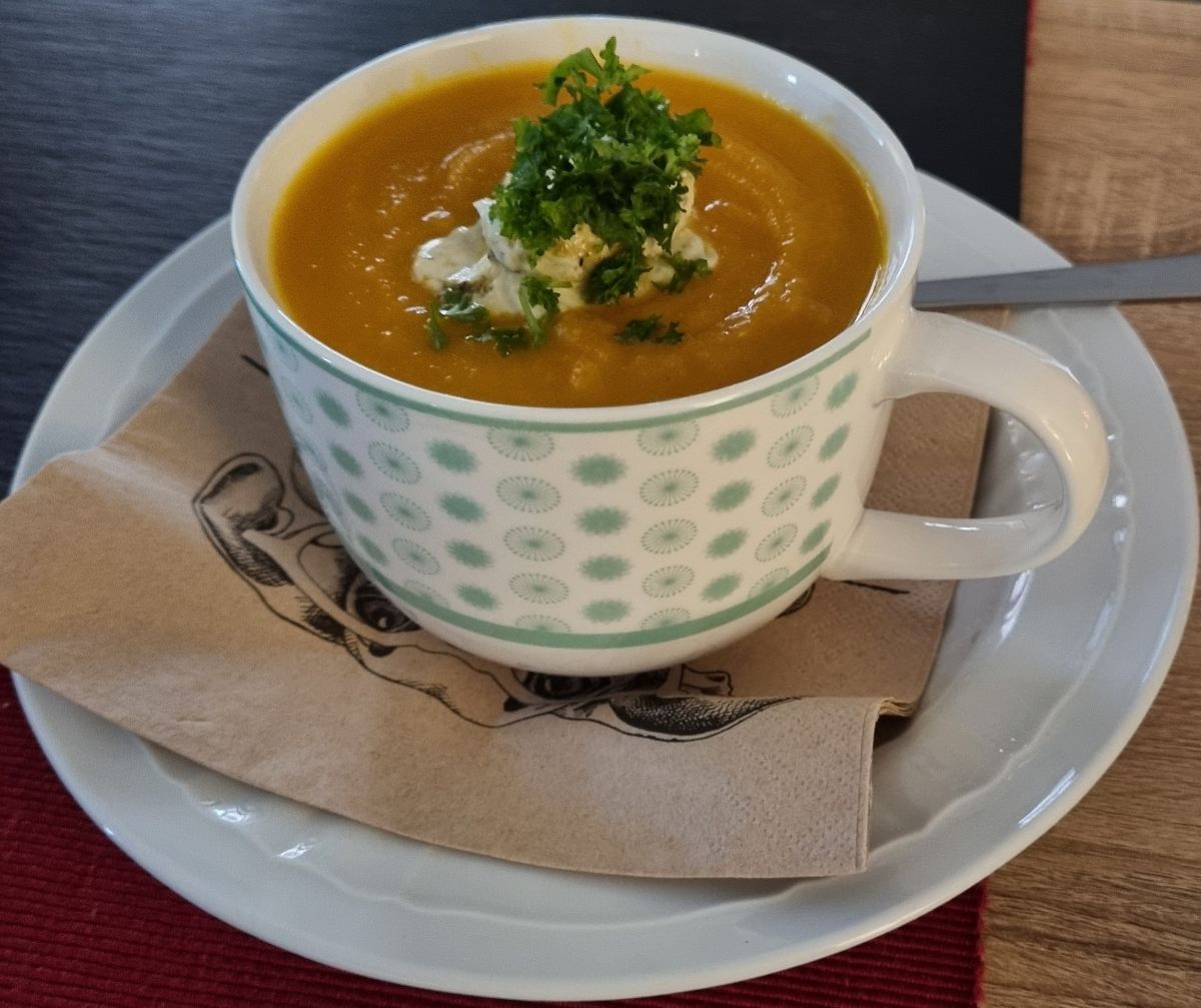 Een lekkere knolselderij - wortelsoep gemaakt met pesto en peterselie. Winterwortelen, basilicum en peterselie uet.