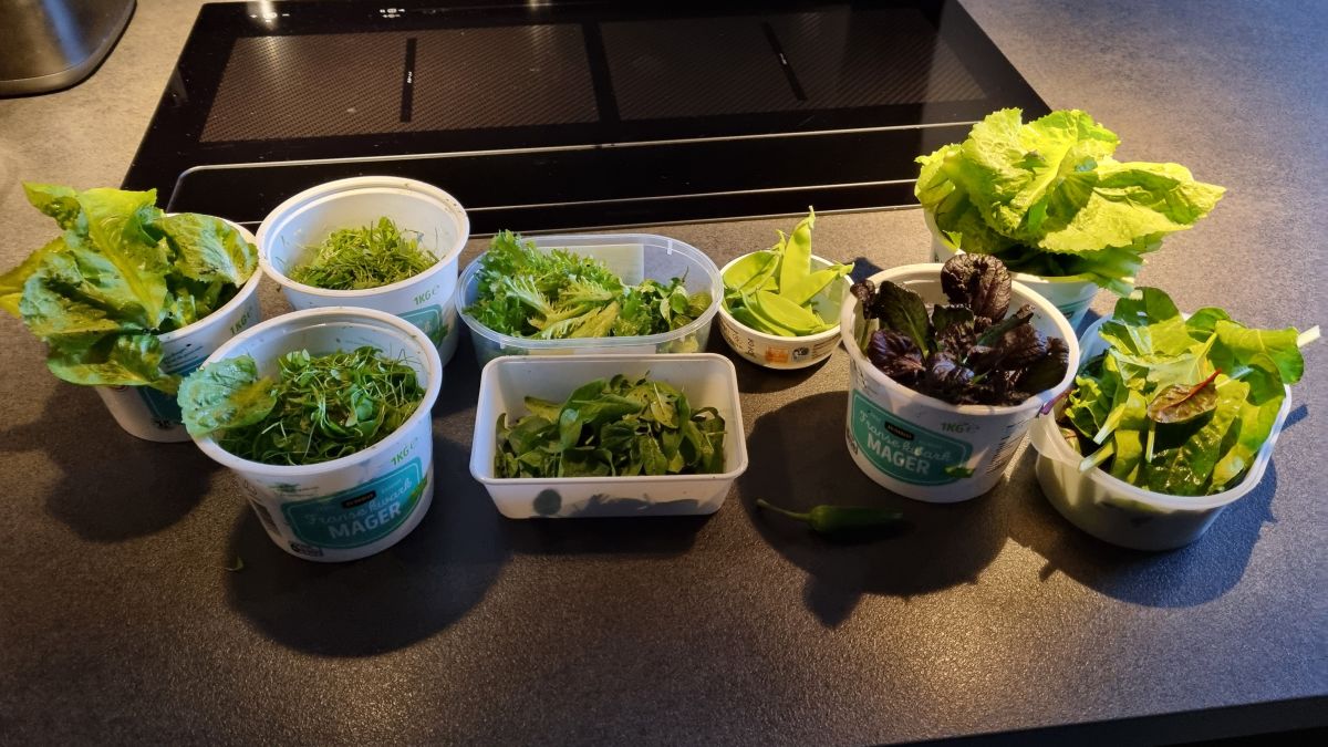 Nog heel veel uit de tuin gehaald. Gisteren de Algiersla en Brandnetel voor de thee. Vandaag: Postelein Crystalsla, veldsla Spinazie Sugarsnaps Tatsoi Rode Tatsoi Snijbiet 4 soorten: Steel, Charley, Fireworks en Lucullus. Morgen weer verder.