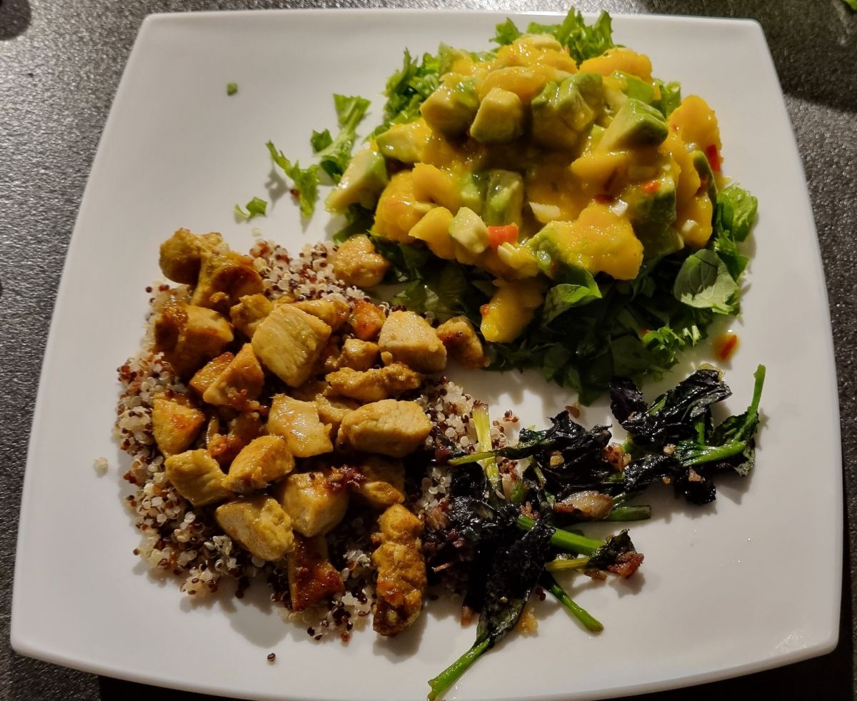 Vanavond weer wat lekkers gemaakt a.d.h.v. wat ik allemaal uit de tuin haalde vandaag. 3 Soorten salade uet en mango-avocado salsa gemaakt met Espelette pepertje uet. Quinoa Tricolor met kerriekip erbij en gebakken Tatsoi en Rode Tatsoi uet met gember, sojasaus, sesamolie en knoflook.
