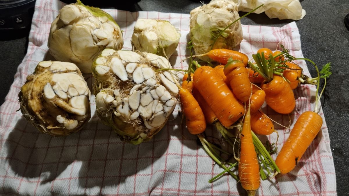 Oogst van vandaag, moest eruit nu, want er staat nog meer voordat het nog kouder wordt. Viel niet mee met dit weer, gelukkig stond ik droog met het schoonmaken. 5 Knolselderijen, voor het eerst dat ik ze heb, valt niet tegen. Winterwortelen, vallen wat klein uit maar goed te gebruiken Preien met de dikte van bosuitjes, was met het voorzaaien niet helemaal goed gegaan. Snijselderij en wat selderijblad van de knol. Andijvie want de vogels lieten er van alles overheen vallen en met de regenbuien kunnen ze gaan rotten. Dus net op tijd.