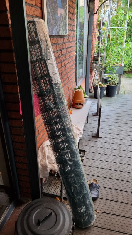 Gisteren gaas binnen gekomen ter vervanging van de plastic rekken die bij de pompoenen had geplaatst. Dat is materiaal van niets (foto rechts). En gelijk nog wat over om het ook aan de schutting te hangen aan 2 kanten, voor en achter. Want ook die netjes zijn niet sterk (foto links).