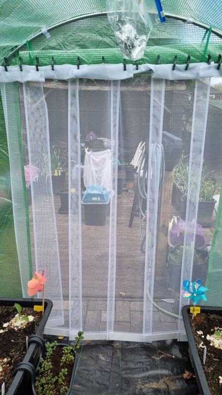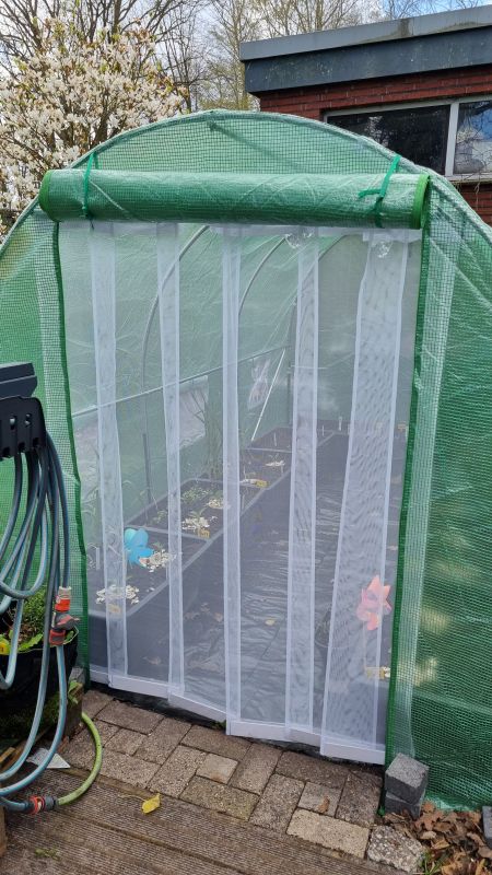 Mijn zaden zijn ook gisteren binnen gekomen, ik wilde nog zomer andijvie erbij. Gelijk nog winter andijvie en Choy Sum erbij genomen, anders zonde van de verzendkosten. Ik zocht ook een speciale sla, maar die hadden zij weer niet. En van de week deze hordeur bevestigd. Wij hadden er nog 2 pakken van liggen, dus later heb ik er nog een gordijnflap bij laten zetten, zodat ze wat breder over elkaar vallen. Maar met wind waaien ze toch steeds om, maar ik neem aan dat er dan niets naar binnen vliegt (hoop ik). Binnen en buitenkant