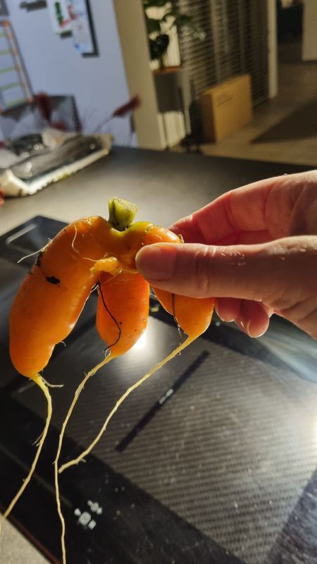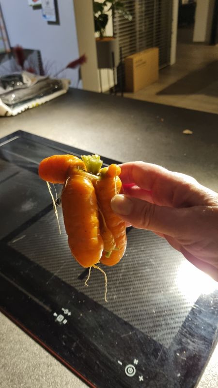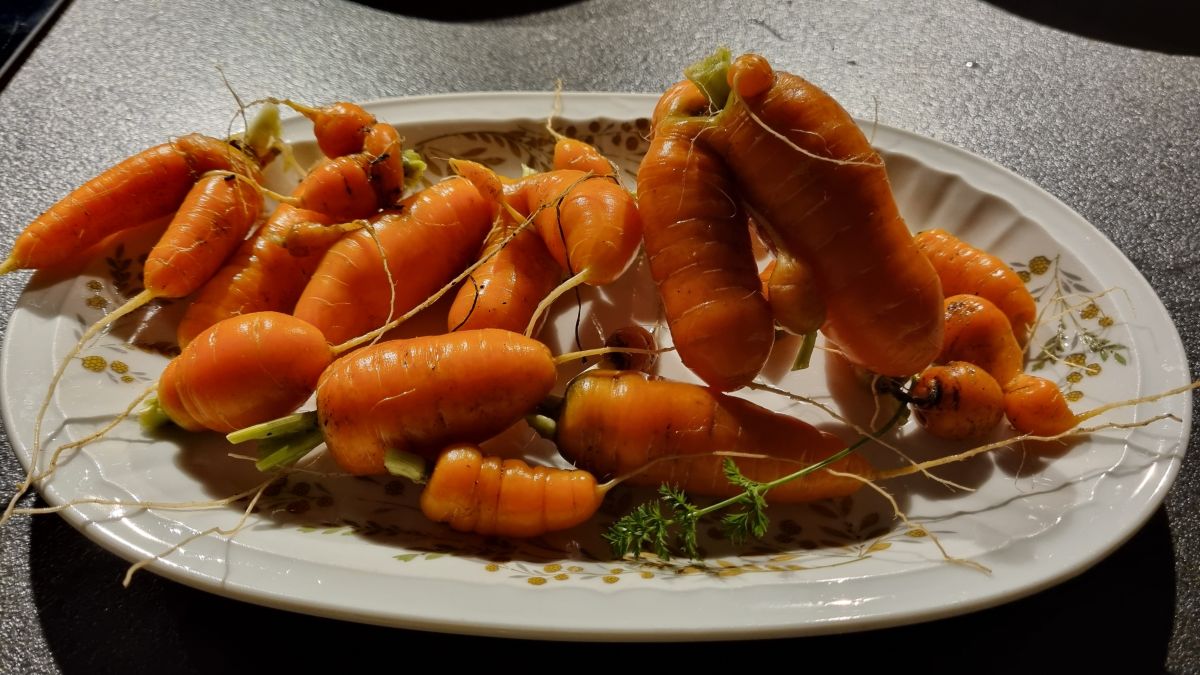 Winterwortel geoogst, wel rare vormen. Ze stonden niet echt te dik bij elkaar, maar het groen ging elke kant op. Op die plek niet echt veel zon, maar ik heb er wel eerder wat dikkere en grotere wortels eruit gehaald. Maar goed, ook die wortel zijn te eten.