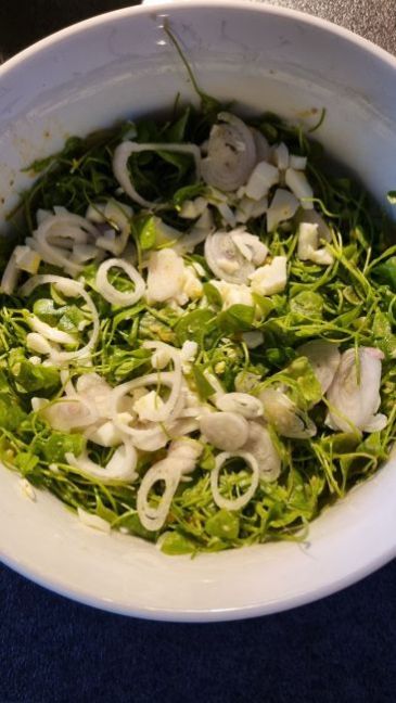 Postelein in eiersaus Nodig voor 2 personen: 🌱 75 - 100 gr postelein 🌱 1 kleine ui of sjalot 🌱 1 ei hard gekookt 🌱 1 tl mosterd 🌱 1 tl mosterdaus of mayonaise 🌱 1 tl rodewijn azijn 🌱 1 el olijfolie 🌱 Peper Werkwijze: 🍜Was de postelein, laat hem uitlekken en doe hem in een kom. 🍜Pel de ui en snijd hem in dunne ringen. 🍜Pel het ei en snijdt het doormidden. Snijdt de eiwitten fijn en doe de eidooiers in een ander kommetje en prak de ei fijn. Voeg azijn, olie, mosterdsaus (of mayonaise) en mosterd toe aan de eidooier. 🍜Meng alles tot een gladde saus via een kleine garde en voeg wat peper toe. Voeg de saus over de salade en meng het goed. 🍜Garneer met de uienringen en eiwitblokjes.