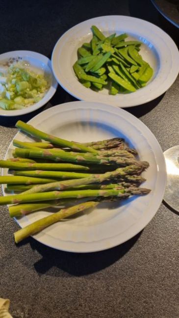Kip, asperges en peulen curry. Ik had asperges in de koelkast liggen, vandaag peulen en sugarsnaps geoogst en dan zoek ik op wat ik ermee kan maken. Ik gebruik geen currypasta e.d. dan gebruik je dat een keer en dan blijft het staan b.v. Ik doe het met de kruiden die ik heb. En dan pas ik het e.e.a. aan. Maar het was zo lekker! Moest met noedels en gevogelte bouillon etc. en eigenlijk de hoeveelheid die ik voor de asperges heb gebruikt voor de peulen/sugarsnaps en andersom. Maar zoals ik het heb gedaan dus erg geslaagd volgens mijn man en hij blijft er dus in. Het recept heb ik net uitgeschreven.