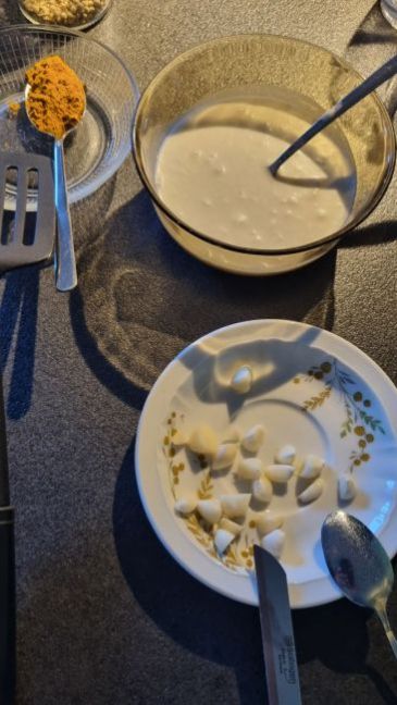 Postelein in eiersaus gegeten (echt goddelijk en eenvoudig om te maken). Ik heb er wat patat erbij gedaan en een "Frühlingsrol" Een vegetarische rol wat lijkt op een loempia en uiteraard knoflooksaus erbij. Ik schrijf het nog uit.