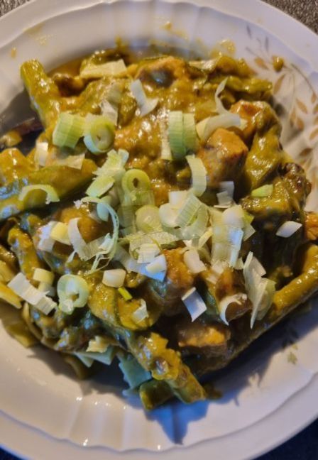 Kip asperges en peultjes curry voor 2 p Nodig: 🌱100 gr Macaroni of Tagliatelle 🌱150 gr asperges 🌱75 gr peultjes 🌱3 tenen knoflook 🌱200 ml kokosmelk 🌱1 el curry Madras 🌱1 el olijfolie 🌱1 el sesamolie 🌱1 kipfilet of kalkoen 🌱2 lente-uitjes 🌱Koriander poeder of vers 🌱200 ml bouillon 🌱Peper en zout Werkwijze: 🍜 Kook de macaroni of Tagliatelle gaar volgens de aanwijzingen op de verpakking. 🍜 Pel en snipper de knoflook. Snij de kipfilets of kalkoen in stukjes. Snij de harde stukken van de groene asperges. Maak de peultjes schoon. Maak de lente-uitjesschoon en snijdt ze in ringetjes. 🍜 Verwarm de sesamolie en de olijfolie in een pan. Voeg de kip of kalkoen en de curry toe. 🍜 Bak de kip of kalkoen 2 minuten aan. Voeg de peultjes en de groene asperges toe. 🍜 Bak ze 2 minuten en voeg de bouillon en de kokosmelk toe. Laat de curry 15 minuten sudderen totdat de asperge en peulen gaar zijn. 🍜 Voeg wat peper en zout toe en als je koriander kruid gebruikt, voeg ook dat toe. 🍜 Doe de macaroni of Tagliatelle op de borden. Voeg de groente toe en garneer met de lente-ui en de verse koriander, als je geen kruiden gebruikt.
