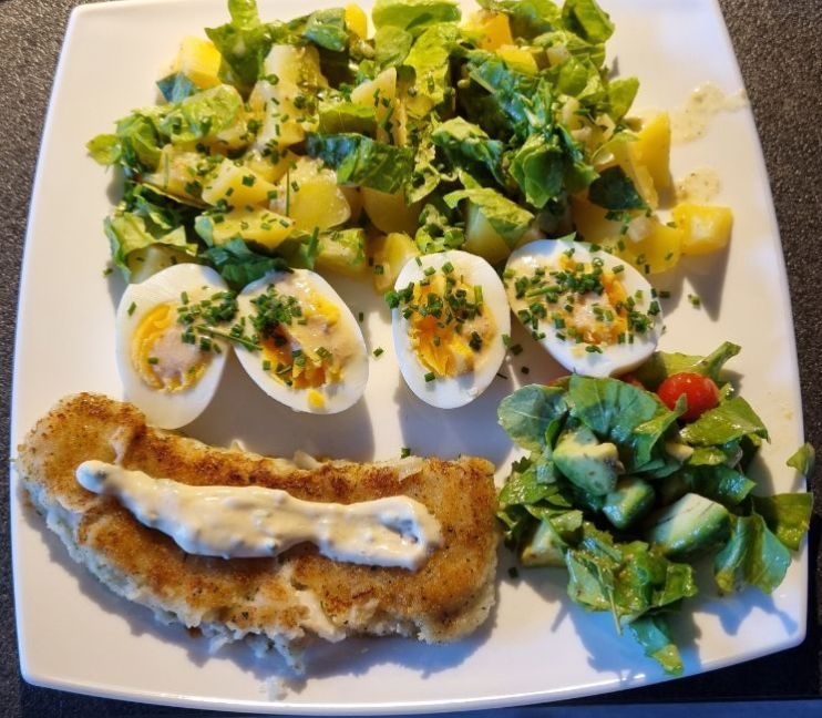 Mosterdeieren met groene salade Nodig voor 2 porties: 🌱 350 gr aardappelen 🌱 4 eieren 🌱 75 gr room 🌱 Sla naar behoefte 🌱 10 stelen bieslook 🌱 1 ui 🌱 Zout en peper 🌱 1 el koolzaad- of olijfolie 🌱 2 tl bloem 🌱 250 ml groentebouillon 🌱 2 el mosterd Werkwijze: 🍜 Aardappel schoonmaken en in stukjes snijden. De ui schoonmaken en in kleine stukjes snijden. 🍜 Aardappel in 10 minuten gaar koken. 🍜 Eieren in 9 minuten gaar koken. 🍜 Bak de ui even aan en voeg de bloem toe. Voeg dan de room en de bouillon toe en laat even doorkoken. 🍜 Voeg de aardappel, mosterd, peper en zout toe. 🍜 Was de sla en snijd het in repen of knip het in stukjes. 🍜 Pel de eieren en snijdt ze in helften. 🍜 Knip de bieslook in kleine stukjes. 🍜 Dien de aardappel op met de sla, leg de eieren erop en als laatste de bieslook. Ik heb nog wat wintersla salade gemaakt met avocado en tomaat met een lekkere dressing van honing, mosterd, notenolie en balsamico azijn en een gebakken vis erbij. Vond je dit een lekker recept, dan zou ik het leuk vinden als je een reactie zou willen geven op de Facebook groep. Voor meer zelfverzonnen recepten ga dan naar deze groep (even lid worden). https://www.facebook.com/groups/lekkerengezondkokenmetpetra