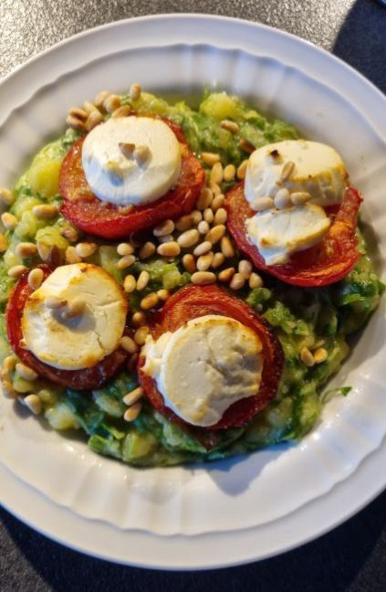Stamppot postelein tomaat en kaas voor 2 personen Nodig: 🌱 350 gr aardappelen 🌱 400 g Tomaten (4 stuks) 🌱 110 g postelein 🌱 8 zachte geitenkaasjes 🌱 ½ bakje creme fraiche of room met geraspte kaas (Cheddar flakes b.v.) 🌱 4 el pijnboompitten Dressing: 🌱 ½ el witte balsamico azijn 🌱 1 el olijfolie 🌱 2 teentjes knoflook 🌱 peper en zout Olijfolie voor de ovenschaal om in te smeren 🍜 Verwarm de oven voor op 220 graden bij hetelucht oven op 200 graden. 🍜 Maak de dressing van de olijfolie, de geperste knoflook, peper, zout en de balsamico-azijn. 🍜 Halveer de tomaten, leg ze met de open kant naar boven in een ovenschaal en besprenkel met het oliemengsel. Bak de tomaten in 20-25 minuten. 🍜 Schil de aardappels en kook de aardappelen gaar in 20-25 minuten. 🍜 Was de postelein en maak ze droog met de slacentrifuge. Knip ze wat kleiner. 🍜 Rooster de pijnboompitjes in een droge koekenpan. 🍜 Haal de tomaten uit de oven en leg op elk tomaatje een plakje geitenkaas. Zet terug in de oven laat de kaas smelten. Je kunt het ook nog even onder de gril zetten. 🍜 Stamp de aardappels fijn met de creme fraiche, peper en zout (of room met geraspte kaas) Roer dan de postelein erdoorheen en leg de geroosterde tomaten erop. 🍜 Strooi de pijnboompitten erop. Vond je dit een lekker recept, dan zou ik het leuk vinden als je een reactie zou willen geven op de Facebook groep. Voor meer zelfverzonnen recepten ga dan naar deze groep (even lid worden). https://www.facebook.com/groups/lekkerengezondkokenmetpetra