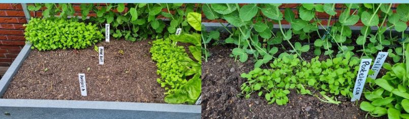 Onderin stonden allemaal dikke stelen, en dat vindt mijn man te hard. Het gaat mij om de bladeren. Ik heb een rijtje opnieuw gezaaid ertussen en zie wat er van de andere gebeurt. Hoewel er eentje al in bloei schoot, dus ik denk dat ik ze eruit moet halen. Ik heb vandaag wel 3 blaadjes eraf gehaald en in de salade verwerkt.