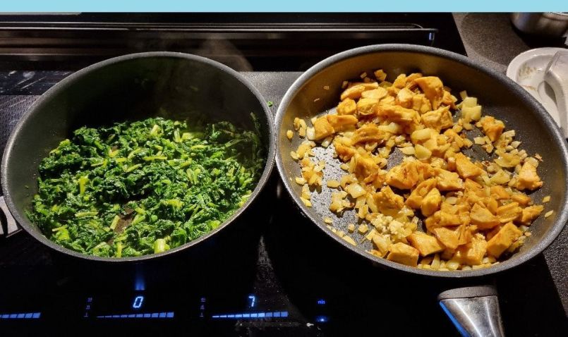 Raapstelen stamppot met pittige kip voor 2 personen Nodig: 🌱 600 gr aardappelen 🌱 300 gr raapstelen in repen geknipt 🌱 30 gr roomboter 🌱 2 tenen knoflook in kleine stukjes 🌱 2 el zure room 🌱 1 ui in kleine stukjes 🌱 1 el mosterd 🌱 1 groentebouillonblokje zonder gist 🌱 1 el kerrie Werkwijze: 🍜 Kook de aardappelen gaar in 20 - 25 minuten samen met het bouillonblokje. Zorg dat de aardappelen net onder staan, dus niet te veel water in de pan. 🍜 Giet de aardappelen af, maar bewaar het vocht. Stamp de aardappelen fijn en voeg de zure room en de mosterd toe. Als de puree te droog is, voeg dan wat bouillon toe en eventueel wat peper en zout. Je kunt ook wat bouillon later aan het vlees toevoegen. 🍜 Smelt intussen de boter in een wok of grote koekenpan en bak de ui even aan, voeg de knoflook toe en bak even mee. 🍜 Voeg dan de raapstelen toe en roerbak kort mee. 🍜 Voeg de raapstelen toe aan de puree en roer ze door. 🍜 Bak in een andere koekenpan de kip of vegetarische kip even aan met de kerrie. 🍜 Doe de puree op de borden en voeg de kip of vegetarisch toe. TIP: als je te weinig raapstelen hebt, kun je ook meiraapblad toevoegen, zoals ik gedaan heb. Vond je dit een lekker recept, dan zou ik het leuk vinden als je een reactie zou willen geven op de Facebook groep. Voor meer zelfverzonnen recepten ga dan naar deze groep (even lid worden). https://www.facebook.com/groups/lekkerengezondkokenmetpetra