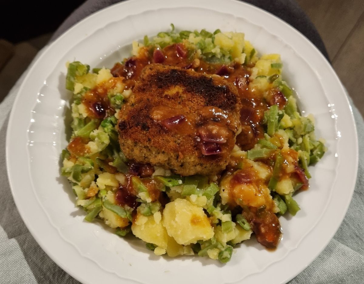 Stamppot aardappel met snijbonen met een pittig jusje van pepertje, ui en knoflook en vegetarisch stukje. Wat een luxe nu elke dag uit de vriezer groente te pakken uet. (snijbonen en pepertje, de rest is op of lukte niet).