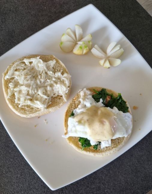 Vandaag heb ik dit gegeten, ik heb het recept uitgeschreven. Gepocheerde ei met zalm en spinazie op een geroosterd broodje en nog wat een half broodje selderij salade en wat gele radijs erbij. Achteraf had ik wel 2 van dit soort broodjes willen eten, ik had spinazie genoeg. Maar morgen heb ik weer spinazie nodig en dan veel, dan moet ik mijn snijbiet aanspreken en ik denk ook wat uit de vriezer.