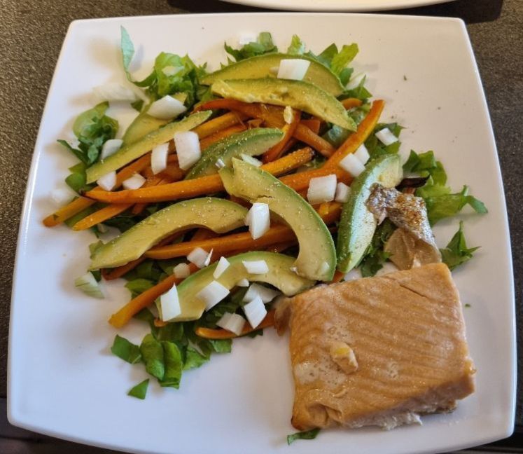 Gegrilde wortel met salade Nodig voor een maaltijdsalade voor 2 personen 🌱1 avocado 🌱250 gr wortels 🌱50 gr sla en/of rucola 🌱1 kleine ui 🌱verse peper Voor de dresssing 🌱1 tl komijnpoeder 🌱3/4 tl paprikapoeder 🌱3/4 tl gemberpoeder 🌱1 teen knoflook 🌱2 el extra vergine olijfolie 🌱1 citroen 🌱1 sinaasappel 🌱Extra olie voor het invetten van de ovenschaal Werkwijze: 🍜 Verwarm de oven voor op 200 graden, bij hete lucht oven op 180 graden. 🍜 Maak de wortelen schoon en snij ze in de lengte door vieren of als het dikke wortelen zijn in zessen. 🍜 Doe flink wat olijfolie in een ovenschaal en verdeel het met een kwastje. Is belangrijk, want anders verbrandt de wortel. 🍜Hak, snij of pers de knoflook fijn en meng ze in een schaaltje met de kruiden en olijfolie. 🍜 Was de sinaasappel en citroen grondig en snij ze in plakjes. 🍜 Bewaar wat citroen uiteindes en pers een beetje boven de dressing uit. 🍜 Leg de schijfjes citroen en sinaasappel op de wortelen en voeg de dressing toe, mix de dressing goed door de wortelen en het fruit. 🍜 Gril de wortelen 30 minuten in de oven, halverwege roer je alles nog even om. 🍜 Intussen maak je de sla klein (knippen) en verdeel ze op de borden. 🍜 Snij de ui in kleine stukjes of reepjes. 🍜 Maak de avocado schoon en snij ze in plakken. Sprenkel er wat citroen over. 🍜 Verdeel de wortelen en plakjes avocado op de sla, strooi er wat ui over. Heb je nog wat dressing in de schaal, verdeel dat over de borden en dan als slot wat verse peper erover.