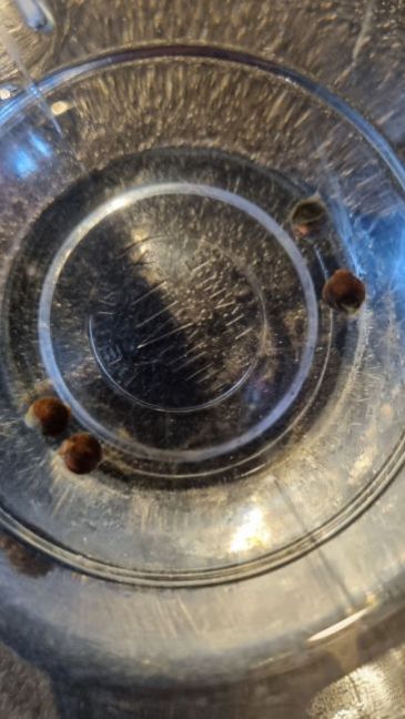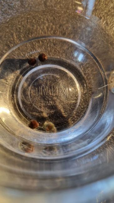 De Malabar spinazie zaden in een potje gedaan. Ik had ze 4 dagen laten weken en ze gaven al kleine worteltjes zag ik.