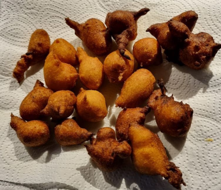 Ik heb vandaag iets speciaals gemaakt. Eigenlijk had ik dit al veel eerder willen maken. Dit wordt in Spanje op 1 november gegeten, tijdens Allerheiligen. Maar ik heb ze dus vandaag gemaakt en met pompoen. Want je kunt ze ook standaard maken met water, bloem, boter en ei en dan dopen in de poedersuiker of kaneelsuiker. Maar ik koos natuurlijk voor de groenteversie met pompoen. Ik ben super enthousiast, want ik ga ze vaker proberen. Nu heb ik ze met suiker gevuld en ik had de helft van het recept genomen, maar van de week ga ik ze nog een keer maken en dan met kruiden vullen. Jullie horen nog van mij en dan zal ik de fotos vervangen. Buñuelos met pompoen Nodig: 🌱250 gr pompoen 🌱160 gr tarwebloem 🌱Voor de zoete versie: 40 gr gele basterdsuiker 🌱Voor de hartige versie: peterselie, zout, knoflookpoeder, peper, kerrie naar smaak 🌱1 medium ei 🌱15 gr bakpoeder 🌱Bakolie Werkwijze: 🍜 Kook de pompoen 10 minuten, laat ze uitlekken en pureer ze dan met een vork of stamper. 🍜 Voeg de suiker toe voor de zoete versie en de kruiden voor de hartige versie, dan zeef je 1600 gr tarwebloem en 15 gr bakpoeder erbij. Meng dit goed. 🍜 Voeg dan het ei toe en roer het weer goed door. Het moet een stevige massa worden, anders voeg je wat bloem toe. Als het te dik is, kun je wat water toevoegen. 🍜 Doe ruim olie in de pan, ze moeten straks drijven op middelhoog vuur. De olie mag niet warmer dan 130 graden worden. Zodat de beignets van binnen gaar zijn, maar niet te snel gaar worden. Ik heb het een beetje op gevoel gedaan. Zet in ieder geval het vuur niet te hoog, de olie mag beslist niet walmen. Eerst de olie opwarmen, daarna weer wat lager zetten als het te warm wordt. 🍜 Met behulp van 2 koffielepels ga je de beignets maken, neem een beetje deeg, maak een ronde vorm en plaats ze in de pan. Het wilt helpen dat als je het deeg in de pan laat vallen, de lepeltjes gelijk draait, zodat er geen overtollig deeg in valt. 🍜 Ze draaien zichzelf om, gebeurt dat niet, dan moet je met behulp van een vork ze omdraaien. Als ze goudbruin zijn, pak je ze op met een spaan en legt ze op een bord met keukenpapier. TIP: Je kunt ze dan bestrijken met wat suiker en kaneel voor de zoete versie. Voor de hartige versie kun je ze in een sausje dippen, b.v. tomatencurry of knoflooksaus.