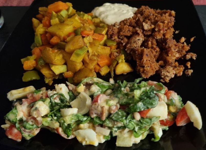 Mix aardappelen, vegetarische balletjes en salade Nodig: Bepaal zelf de hoeveelheden. 🌱aardappels 🌱wortel 🌱3 kleuren paprika 🌱ui 🌱avocado 🌱kruiden: Ras el Hanout Paprika Gember K-kruiden: Kaneel, Kurkuma, Koriander, Kardamon, Kerrie 🌱Vegetarische kikkererwten – quinoa balletjes 7 stuk (zie recept elders) Tomatenketchup 🌱Salade avocado geitenkaas, zie recept elders. Nu toegevoegd: 2 eieren, gemsla, pecannoten en geroosterde pijnboompitten 🍜 Schil de aardappels en snijdt ze in 3- hoekjes. Kook ze 15 minuten en giet ze af. 🍜 Maak de wortelen schoon, snijdt ze in stukjes en kook ze ook 15 minuten, giet ze af. 🍜 Maak de ui en de paprika schoon. 🍜 Bak de ui een paar minuten. Doe ze op een bord. 🍜 Bak de aardappelen, voeg de uien en de overige groente erbij en bak totdat ze gaar zijn. 🍜 Intussen maak je de salade. Omdat bij mij de avocado niet rijp was, heb ik het met de groente meegebakken en heb ik bij de salade dus wat anders toegevoegd (sla, ei en noten). 🍜 Ik heb wat olie in een pannetje gedaan en de vegetarische kikkererwten fijn geprakt en weer even opgebakken. Omdat ze erg droog waren, heb ik er tomatenketchup aan toegevoegd en dat smaakte zo lekker, dat ik het apart op het bord heb gedaan en niet door de groente heen. En het smaakt natuurlijk nog lekkerder met knoflooksaus. Vond je dit een lekker recept, dan zou ik het leuk vinden als je een reactie zou willen geven op de Facebook groep. Voor meer zelfverzonnen recepten ga dan naar deze groep (even lid worden). https://www.facebook.com/groups/lekkerengezondkokenmetpetra