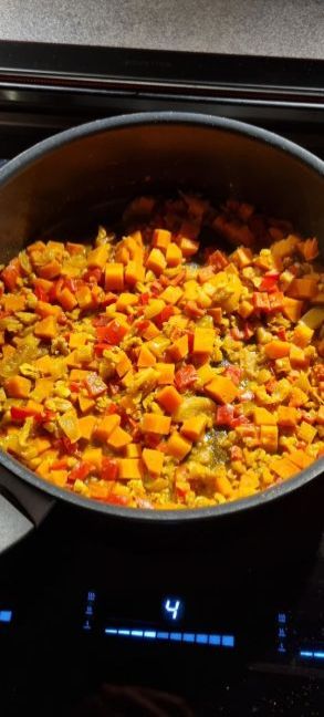 Donderdag: overblijfsel van de krokante aardappelen opgewarmd en dan met een broodje. Moet ik volgende week weer maken zei mijn man. Een stuk is veel te weinig. Vrijdag: overblijfsel van de vegetarische balletjes opgewarmd, ook met een broodje met saus uit een fles. Zaterdag: Chili sin carne, met een prei erbij, vegetarische hak. De bonen waren al een jaar oud, 2 uur gekookt en later met de groente nog zo'n half uur, maar toch nog stevig helaas. Zondag: vandaag weer gemakkelijk. Diverse hapjes zoals: augurk met lapje salami. olijven, stukjes brood met pesto die ik had ingevroren, basilicum was uit de tuin.