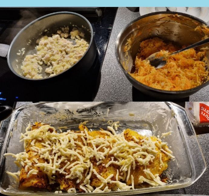 Krokante aardappel met vulling Nodig: Voor de aardappelkorst (3 personen): 🌱 ongeveer 700 g aardappelen, geraspt 🌱 1 ui, fijngehakt 🌱 1 redelijk grote wortel, geraspt 🌱 2 teentjes knoflook, fijngehakt 🌱 1 ei 🌱 2 eetlepels bloem 🌱 Zout en peper naar smaak Voor de kip- en champignonvulling: 🌱 ongeveer 150 g kipfilet, in blokjes gesneden 🌱 ca. 200 g champignons, in plakjes gesneden 🌱 2 uien, fijngehakt 🌱 120 ml room, 20% vet 🌱 Gedroogde knoflook naar smaak of vers 🌱 Currypoeder naar smaak 🌱 Zout en peper naar smaak 🌱 1 eetlepel om te bakken Voor de afwerking: 🌱 150 g mozzarella, geraspt 🌱 Wat plantaardige olie om te bakken 🌱Een bosje lente-uitjes, fijngesneden ter garnering Werkwijze: 🍜Rasp de aardappelen en verwijder overtollig vocht grondig door een schone theedoek of kaasdoek te gebruiken om het vocht uit de geraspte aardappelen te persen. 🍜Meng in een grote kom de geraspte aardappelen met de fijngesneden ui, geraspte wortel en gehakte knoflook. 🍜Klop het ei los en voeg de bloem toe. Kruid rijkelijk met peper en zout. Meng alles goed totdat het mengsel licht plakkerig is en zijn vorm behoudt. 🍜Smelt de boter in een grote koekenpan op middelhoog vuur. Voeg de fijngehakte uien toe en bak tot ze glazig en geurig zijn. Voeg vervolgens de in blokjes gesneden kipfilets toe aan de pan en roer ze goed. 🍜Als de kip gaar is, voeg je de gesneden champignons toe. Roer totdat het vocht verdampt is van de champignons en de champignons goudbruin zijn. 🍜Breng het mengsel op smaak met gedroogde knoflook, kerriepoeder, zout en peper. Voeg room toe en roer. Laat een paar minuten sudderen tot de vulling iets dikker wordt. Haal van het vuur en zet opzij. 🍜 Doe een beetje plantaardige olie in een pan op middelhoog vuur (niet al te veel, want het wordt dan snel te vet). Neem een portie van het bereide aardappelmengsel, vorm er een koekje van en plaats het in de pan. Druk ze iets plat met een spatel. Bak elk aardappelkoekje ongeveer 3-4 minuten per kant, tot ze goudbruin en knapperig zijn. Plaats de gebakken koekjes op een bord en herhaal het proces totdat al het aardappelmengsel is gebruikt. 🍜 Verwarm de oven voor op 180°C. Neem een krokant aardappelkoekje en plaats een royale lepel kip- en champignonvulling in het midden. Strooi een laagje geraspte mozzarella over de vulling. Vouw de aardappelkorst voorzichtig dubbel en druk de randen lichtjes aan, zodat er een gevuld koekje ontstaat. Plaats de gevulde koekjes in een ingevette ovenschaal. Herhaal dit proces met de resterende korstjes en vulling totdat alle koekjes in elkaar zitten. 🍜Strooi nog wat geraspte mozzarella op elk gevuld koekje om extra romigheid toe te voegen. Plaats de ovenschaal in de voorverwarmde oven en bak 15-20 minuten, tot de kaas gesmolten en licht goudbruin is. 🍜Haal de gevulde koekjes uit de oven en bestrooi met vers gehakte lente-uitjes om een vleugje kleur en een milde, frisse smaak toe te voegen. Serveer deze heerlijke kip- en champignonkoekjes met aardappelkorst warm. Vond je dit een lekker recept, dan zou ik het leuk vinden als je een reactie zou willen geven op de Facebook groep. Voor meer zelfverzonnen recepten ga dan naar deze groep (even lid worden). https://www.facebook.com/groups/lekkerengezondkokenmetpetra