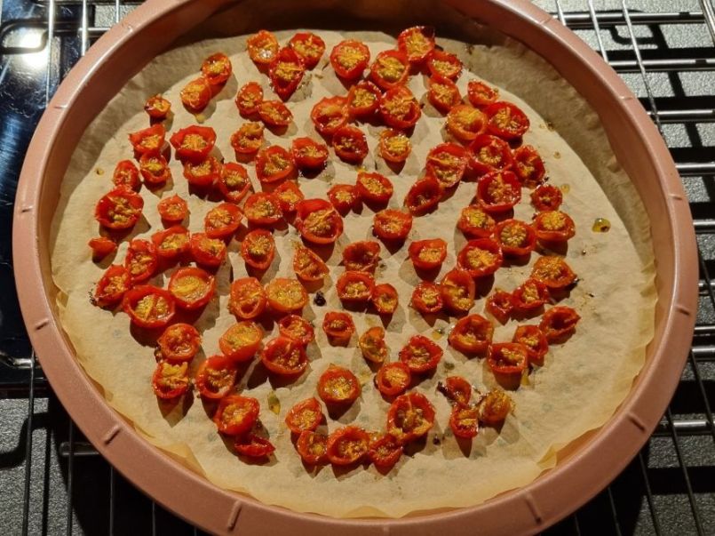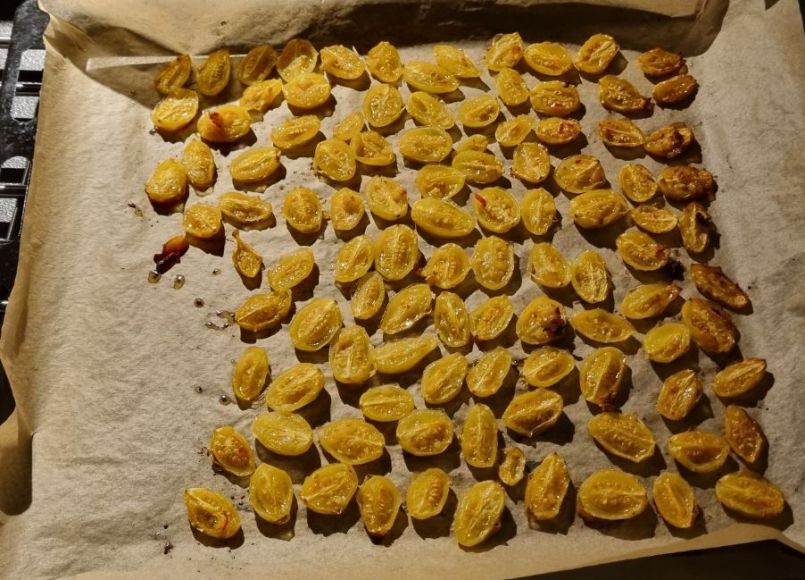 Gedroogde kerstomaatjes uit de oven Nodig: 🌱± 50 kerstomaatjes (geel of rood) 🌱4 teentjes knoflook, geplet (of meer) 🌱1 rode peper, in reepjes 🌱1 koffielepel stevia (of suiker) 🌱4 el olijfolie 🌱10 druppels citroen 🌱Zeezout 🌱evt. paar druppels wijnazijn 🌱1 tl saffraandraadjes 🌱bosje korianderblad (of gedroogd) Werkwijze: 🍜Was en halveer de tomaatjes. 🍜Marineer ze in een dressing van een mengsel saffraan, knoflook, peper, stevia of suiker, olijfolie, citroen, (azijn) en zeezout. Doe dat in een grote schaal of kom die je af kunt sluiten. 🍜Haal de tomaatjes uit de dressing en laat de dressing in de schaal of kom. 🍜Leg de tomaatjes op de bakplaat met de platte kant naar boven en laat ze gedurende 1 uur drogen in een oven van 130 graden. 🍜Laat de tomaatjes afkoelen en voeg ze weer terug in de dressing en voeg wat korianderblaadjes of wat gedroogde koriander toe. 🍜Lekker op kaas, door salades of door of over stampotten. Omdat ik momenteel 4 gele tomaten heb, moest ik steeds verzinnen wat ermee te doen. Ik heb namelijk ook meegedaan aan testzaden, en daar zat de gele tomaat tussen. Ik heb er al soep van gemaakt en een keer een krieltjessalade, maar mijn man vindt deze tomaatjes het lekkerst. Ik moet zeggen dat ik ze van de gele tomaatjes nog lekkerder vind dan de rode. Ik heb nog vele liggen, dus kan het nog een paar keer maken.