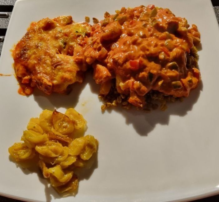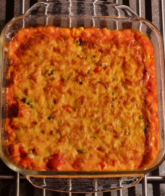 Ovenschotel paprika, kip en kaas Nodig: Voor 2 personen 🌱3 paprika’s in 3 kleuren 🌱1 ui 🌱2 tenen knoflook 🌱2 el koolzaadolie 🌱Zout en peper 🌱Gerookte paprika ½ tl 🌱250 gr kipfilet 🌱200 ml kook- of slagroom 🌱Blikje 70 ml tomatenpuree 🌱1 el tomatenketchup 🌱100 gr Mozzarella geraspt 🌱25 gr Cheddar geraspt En je kunt er altijd wat aan toevoegen van restjes wat je kwijt wilt. Ik had b.v. wat stengeltjes broccoli van de baby broccoli erbij gedaan. Werkwijze: 🍜Snijd de paprika en uien in kleine stukjes. Snijd de knoflook in stukjes of pers het uit. 🍜Was en droog de kip en snijd in kleine stukjes. 🍜Verwarm de oven voor op 200 graden boven- en onderwarmte. 🍜Bak de paprika en uien in 1 el koolzaadolie een 2 minuten aan. Voeg wat peper en zout toe. Zet even apart. 🍜Bak de kip in 1 el koolzaadolie en bak deze bruin, voeg de laatste minuut de knoflook en de gerookte paprikapoeder toe. Voeg wat peper en zout toe aan het eind. 🍜Voeg de groente bij de kip, samen met de room, tomatenpuree en de tomatenketchup in de pan en roer alles goed door elkaar. 🍜Doe dan alles in een ovenschaal en strooi de kaas erover. 🍜Laat het 15 - 20 minuten bakken in de oven totdat de kaas gesmolten is. Ik had er speltvlokken bij genomen, i.p.v. rijst. Maar aardappels erbij is het lekkerst, omdat je veel saus hebt en het door de aardappels goed opgenomen wordt. Vond je dit een lekker recept, dan zou ik het leuk vinden als je een reactie zou willen geven op de Facebook groep. Voor meer zelfverzonnen recepten ga dan naar deze groep (even lid worden). https://www.facebook.com/groups/lekkerengezondkokenmetpetra