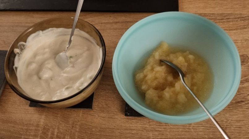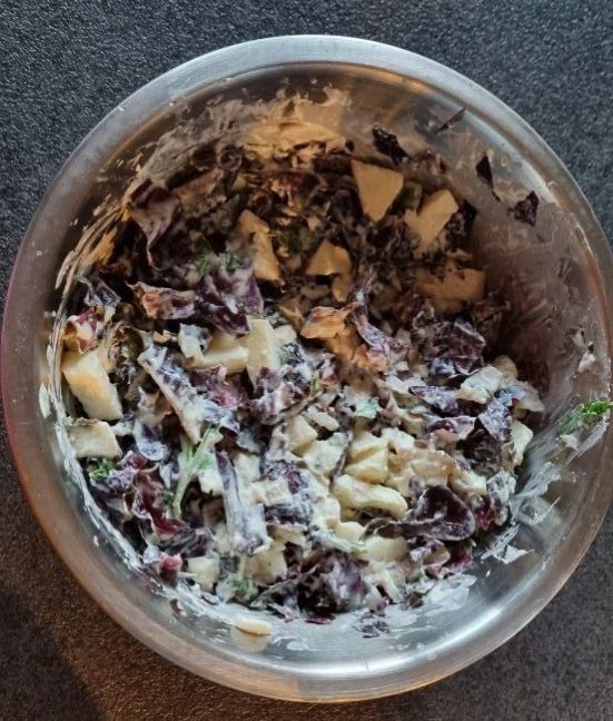 Salade met gerookte paling of forel Nodig voor 4 personen: 🌱200 gr palingfilet of forel 🌱1 grote appel of 2 kleine appels 🌱1 bekertje zure room of schmand (Duits) 🌱1 el mosterd 🌱 1 bosuitje 🌱1 el citroensap 🌱4 porties veldsla of ijsbergsla Werkwijze: 🍜 Snijd de vis in smalle reepjes. 🍜 Schil de appel, verwijder klokhuis en snijd in kleine blokjes. Doe er wat citroensap over tegen het verkleuren. 🍜 Ui pellen en snipperen. 🍜 Roer in de schaal de zure room of schmand met citroensap, mosterd, peper en zout. Roer de vis erdoor. 🍜 Je kunt de sla eerst op borden doen (bij veldsla) of je doet de gewassen en gesneden ijsbergsla door de salade.