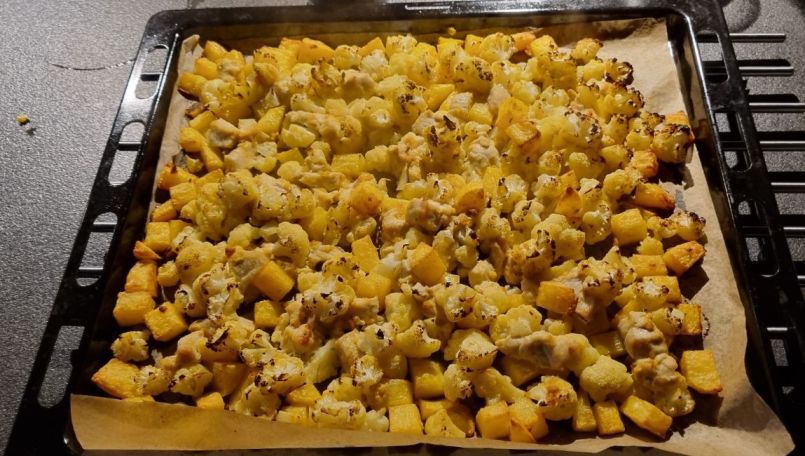 Bloemkool traybake met kip-kerrie Nodig: Voor 2 personen 🌱450 gr aardappelen 🌱500 gr bloemkool 🌱2 of 3 tenen knoflook 🌱4 el koolzaadolie 🌱Zout en cayennepeper 🌱3 tl kerriepoeder 🌱250 gr kipfilet 🌱1 bosuitje 🌱150 ml Griekse yoghurt of 50 ml yoghurt en 100 ml mayonaise Werkwijze: 🍜Verwarm de oven voor op 200 graden. 🍜Was de aardappelen en snijd ze in driehoekjes. Maak de bloemkool schoon en snijd ze in roosjes en de stelen in stukjes. Snijd de kipfilet in blokjes. 🍜Meng de olie met de kerriepoeder en wat peper en zout. 🍜Meng 1½ el van de olie door de aardappelstukjes en leg ze op een stuk bakpapier op de bakplaat. Bak de aardappeltjes in ± 10 minuten. 🍜Meng de overige olie door de bloemkoolroosjes en de stukjes kip. Verdeel deze na de 10 minuten over de bakplaat. Laat het dan nog 20 minuten bakken. 🍜Roer de yoghurt met de knoflook, peper en zout door elkaar. Snij het bosuitje in ringetjes en roer het door de yoghurt. Je kunt ook een combinatie met yoghurt en mayonaise nemen. 🍜Verdeel de traybake over 2 borden en voeg de saus toe. Lekker met wat appelmoes. PS Ik had de knoflook direct door de olie geroerd en dat door de aardappeltjes gedaan, maar dat kun je beter niet doen, want de knoflook verbrandt snel. Vond je dit een lekker recept, dan zou ik het leuk vinden als je een reactie zou willen geven op de Facebook groep. Voor meer zelfverzonnen recepten ga dan naar deze groep (even lid worden). https://www.facebook.com/groups/lekkerengezondkokenmetpetra