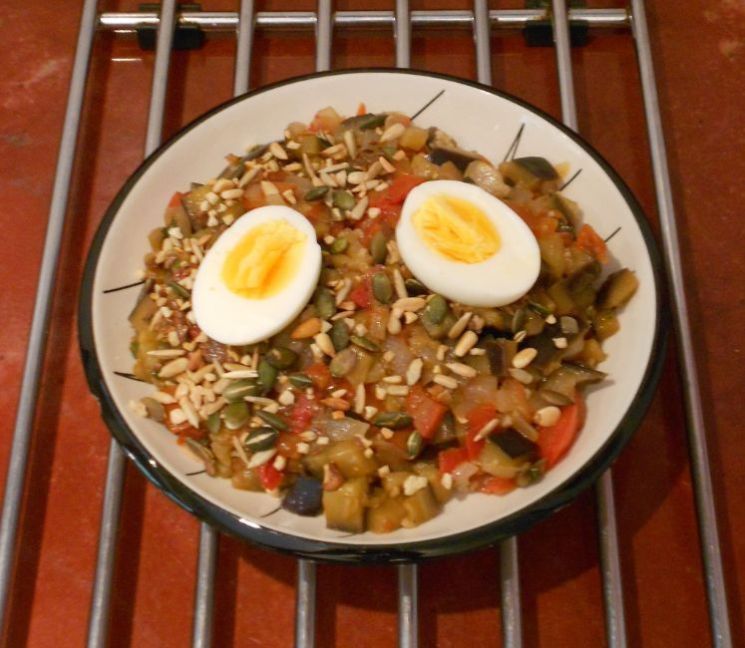 Auberginetajine (vetarm) voor 2 personen Nodig: 🌱125 gram couscous 🌱1 el fijngehakte of geknipte muntblaadjes 🌱Olijfolie 🌱½ theelepel kardemomblaadjes 🌱1 theelepel kaneel 🌱1 ui gesneden in stukjes 🌱1 aubergine in blokjes gesneden 🌱2 tenen knoflook geperst 🌱2 rode pepertjes in stukjes of 1 flinke theelepel sambal 🌱2 vleestomaten in stukjes 🌱1 groentebouillonblokje (zonder gist en zonder suiker) 🌱1 kleine eetlepel honing (reform) 🌱2 hardgekookte eieren gehalveerd 🌱4 eetlepels zadenmix (sesamzaad, lijnzaad, pompoenpitten, pijnboompitten, zonnebloempitten) Werkwijze: 🍜Doe de olijfolie in een pan of wok en verwarm het. Voeg de kaneel en de kardemom toe en roer totdat ze de geur afgeven (30 sec). 🍜Voeg de ui en de aubergine toe en roerbak totdat de aubergine goudbruin is. 🍜Voeg de knoflook, pepertjes of sambal, tomaat, bouillonblokje en 2 dl water toe en stoof alles 10 minuten. Rooster intussen de zadenmix. 🍜Intussen verwarm je anderhalf kopje warm water en doe dat samen met de couscous in een kom. Dek af en laat 5 minuten staan. Roer het los en voeg wat peper, zout en wat munt toe. 🍜Roer de honing door de groentemassa en wat peper en zout. Verdeel de couscous over de borden. Doe er wat zadenmix op en de eieren. Je kunt ook de eieren weglaten en er wat salade bijdoen. Vond je dit een lekker recept, dan zou ik het leuk vinden als je een reactie zou willen geven op de Facebook groep. Voor meer zelfverzonnen recepten ga dan naar deze groep (even lid worden). https://www.facebook.com/groups/lekkerengezondkokenmetpetra