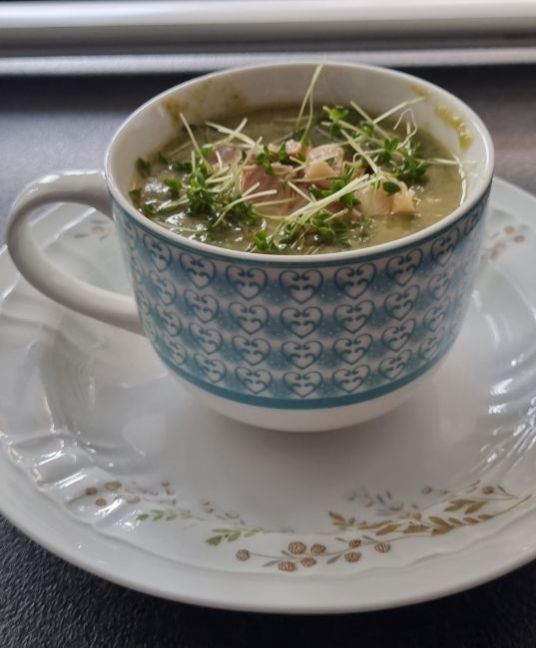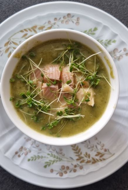 Tuinkerssoep met gerookte forel Nodig voor een maaltijdsoep voor 2 personen: 🌱140 gr gerookte forel in stukjes (of makreel en wat gerookt zout) 🌱1 prei 🌱1 ui 🌱1 stengel bleekselderij 🌱30 gr verse spinazie 🌱2 bakjes tuinkers 🌱1 aardappel 🌱1 dl zure room 🌱3 teentjes knoflook 🌱1 groentebouillon tablet zonder gist 🌱1 kruidentuiltje (of gewoon wat peterselie, tijm en wat oregano, veel lekkerder!) 🌱2 dl Oude Geuze bier (of donker bier) 🌱1 el roomboter 🌱Peper Werkwijze: 🍜 Maak de groente (prei, ui, selderij, aardappel en knoflook) schoon, en snijd in grove stukken. 🍜 Zet een grote pan of wok pot op het vuur met de boter en stoof er de groenten in aan. 🍜Voeg het kruidentuiltje toe, bevochtig met het bier en vul verder met water tot de groenten net onder staan. 🍜Voeg het groentebouillontablet erbij, breng aan de kook en laat het 20 minuten koken. Als je geen kruidentuiltje gebruikt, voeg dan na 15 minuten de verse kruiden erbij. 🍜 Verwijder het kruidentuiltje en doe de soep over in een (soep)pan en mix de soep fijn in de blender. 🍜Zet de soep opnieuw op het vuur. Houd eventueel een beetje tuinkers apart voor de afwerking en mix het voor het serveren de spinazie en de resterende tuinkers door de soep. 🍜Breng verder op smaak met peper en zout. 🍜 Kruid de zure room met peper en zout en roer er een klein scheutje water door zodat die iets vloeiender wordt. 🍜 Je kunt de zure room op je bord verdelen in cirkels of het van te voren in de pan erdoor roeren. 🍜 Dien de soep op in 2 grote kommen en leg daarboven de stukjes forel. Leg er eventueel de rest van de tuinkers erop als versiering. Vond je dit een lekker recept, dan zou ik het leuk vinden als je een reactie zou willen geven op de Facebook groep. Voor meer zelfverzonnen recepten ga dan naar deze groep (even lid worden). https://www.facebook.com/groups/lekkerengezondkokenmetpetra