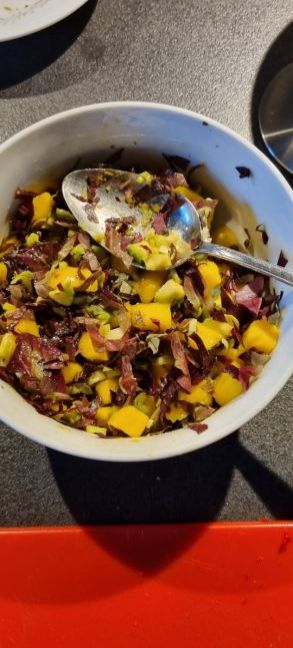 Mango en avocado salade met nootjes Nodig voor 2 personen: 🌱1 Mango 🌱1 Avocado 🌱1 of 2 bosuitjes 🌱1 stengel bleekselderij 🌱2 Romana sla of anders 🌱wat verse koriander of gemalen 🌱25 g pindas Voor de dressing: 🌱 2 of 3 el citroensap 🌱 1 el pindakaas 🌱 2½ el yoghurt 🌱 ½ th appel- of rijstazijn 🌱 3/4 el sojasaus of ketjapsaus 🌱 2 el sesamolie 🌱 stukje gember van 1 cm 🌱 1 chilipepertje 🌱 1 tl honing 🌱 mespunt komijnpoeder Werkwijze: 🍜 Schil de mango en de avocado en snijd beide in plakjes, de bosuitjes en bleekselderij in ringetjes. 🍜 Was de sla goed, centrifugeer ze en scheur of knip ze klein. Was de koriander, maak droog en maak het klein (of poeder nemen). 🍜 Rooster de pinda's in een droge pan. 🍜 Voor de dressing doe je alles in een kom. De gember in hele kleine stukjes of geperst en het pepertje ook heel fijn gesneden. Roer alles goed door. 🍜 Verdeel de sla op de borden en maak het af met de dressing en de geroosterde noten. Ik heb de rode botersla (Salanova) ervoor genomen, die stond al een heel tijdje, zie foto, maar die blijft nog heel erg lang lekker. Lekker met gesmoorde komkommer en gekookte aardappelen en een stukje vis.