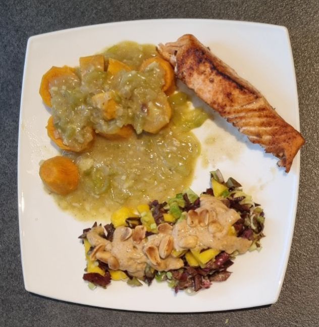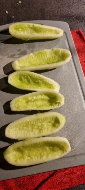 Gesmoorde komkommer voor 2 personen Nodig: 🌱1 uitje of sjalot 🌱2 snackkomkommers 🌱2 ansjovisjes 🌱1 el bloem + 3 el water 🌱200 ml groentebouillon zonder gist 🌱evt wat citroensap 🌱1 eetlepel roomboter Werkwijze: 🍜Schil de komkommer, halveer ze in de lengte en verwijder eventueel de zaadlijsten. 🍜 Snij de komkommer in plakjes. 🍜 Snipper de ui fijn. 🍜 Smelt de boter en fruit de ui glazig. Voeg de stukjes komkommer eraan toe en fruit ze kort mee. 🍜 Voeg de groentebouillon toe en laat het 3 minuten garen met de deksel erop. 🍜Roer de bloem met het water glad en voeg deze toe in de pan. Laat het nogmaals 5 minuten zachtjes pruttelen en voeg dan wat peper, zout en eventueel wat citroensap toe. 🍜 Voeg de stukjes ansjovis toe en warm even mee. Ik had hier zoete aardappelen en zalm erbij genomen en er een salade van mango en avocado erbij gemaakt.