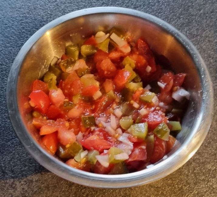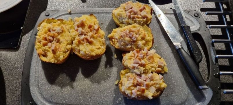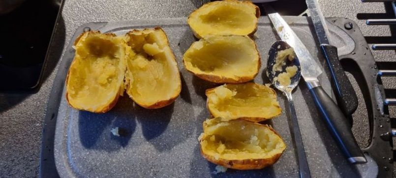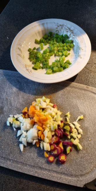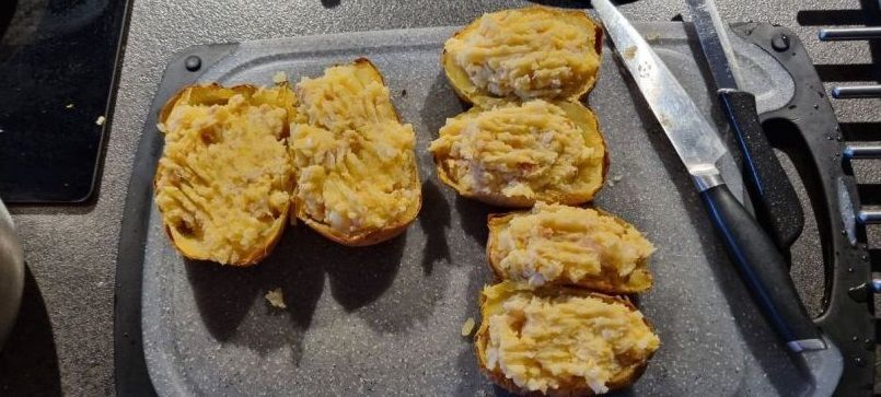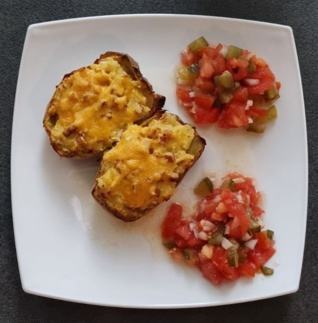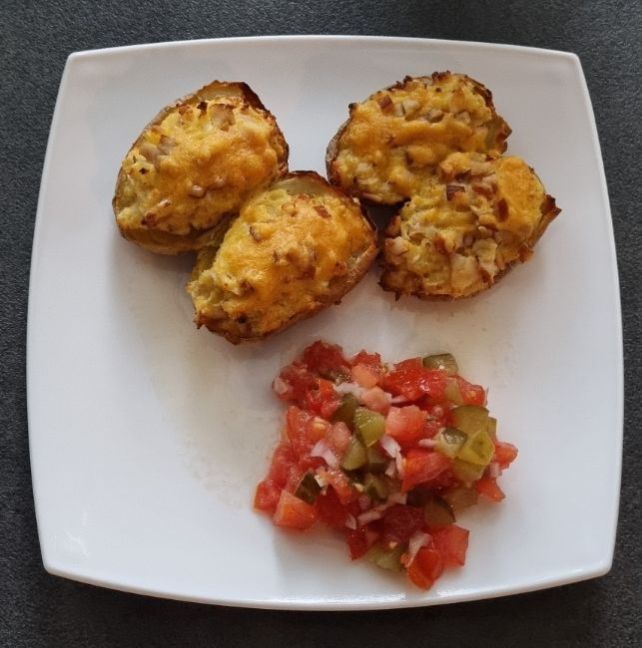 Gevulde aardappel met vis en kaas voor 2 p Nodig: 🌱2 grote aardappels 🌱3 lente-uitjes of 1 sjalot 🌱150 gr gerookte forel in stukjes 🌱2 el crème fraiche 🌱50 gr geraspte cheddar 🌱½ el mosterd 🌱Peper en zout Bereiding: 🍜 Verwarm de oven voor op 200 gr, bij hetelucht op 180 gr. 🍜 Prik de aardappels rondom in met een vork, leg ze dan op een stuk bakpapier op de bakplaat en laat ze ongeveer in 60 minuten poffen tot ze zacht aan voelen. 🍜 Laat de oven aan, maar haal de aardappelen eruit en laat iets afkoelen. 🍜 Halveer de aardappels in de lengte. Haal met een lepel voorzichtig het aardappelkruim uit de schil, maar laat een klein laagje zitten. 🍜 Prak het aardappelkruim met de crème fraîche, ⅔ van de lente-ui (of 1 sjalot), de helft van de kaas, de mosterd en wat zout en peper door elkaar. Je kunt alvast een deel van de vis er doorheen mengen of je doet alle vis er doorheen. 🍜 Vul de aardappels met het mengsel. Ik heb dus een beetje vis achtergelaten en dat er bovenop gedaan. Bestrooi het dan met de rest van de kaas. 🍜 Leg de gevulde aardappels weer terug op de bakplaat en bak ze 15 - 20 minuten in de oven tot de kaas goed gesmolten is. Als je lente-ui gesneden had, dan garneer je het met de overige lente-ui. Lekker met een tomatensalade. Deze vleestomaten had ik van een vriendin uit haar moestuin gekregen. Deze wil ik volgend jaar ook graag zaaien, wat zijn die lekker! Ik heb een simpel tomatensalade gemaakt als volgt: 2 Vleestomaten in stukjes 1 sjalot in kleine stukjes 2 stukjes augurk in kleine stukjes Peper en zout Meer was er niet nodig, een lekkere combinatie die ik binnenkort weer ga maken. Mijn man vond het te weinig, die had 1 grote aardappel en ik 2 kleinere. Maar normaal maak ik er ook een beetje salade bij. Sommige fotos staan op zijn kop, ik weet niet hoe ik dat moet verhelpen.