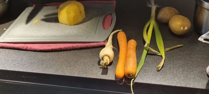 Puree van koolraap, wortel, aardappel en pastinaak voor 2 p Nodig: 🌱 375 gr koolraap 🌱 200 gr aardappelen 🌱 100 gr wortelen 🌱 100 gr pastinaken of knolselderij 🌱 300 ml bouillon 🌱 (1 el boter en wat room, eventueel) 🌱 Peterselie naar smaak 🌱 zout, peper, nootmuskaat Werkwijze: 🍜 Maak alle groente en aardappelen schoon en snijd alles in even kleine stukjes. 🍜 Kook alles in de bouillon in een half uurtje tot het gaar en zacht is. 🍜 Was intussen de peterselie, maak het droog en knip of snijdt het fijn. 🍜 Giet de aardappel/groente af, maar bewaar het in een litermaat. 🍜 Stamp de groente, maar niet al te fijn, het is lekker als het nog een beetje grof is en de afzonderlijke groente kan proeven. 🍜 Doe de kruiden en de peterselie erdoor en nog wat bouillonvocht. Je kunt er eventueel wat boter en/of room door doen. Als je het vega wilt houden, doe er dan Vega balletjes, worsten of gebraden rooktofu erbij. Ik bak dan wat uitjes, wat bloem erdoor en voeg er wat sambal, tomatenketchup, peper en zout toe. Dan heb je een lekkere pittige jus. Maar zonder vlees of vega kan ook, b.v. met courgette burgers en Tzatziki. Zie mijn volgend recept.