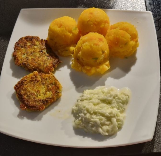 Courgetteburgers voor 2 personen Nodig: 🌱½ el zout 🌱1 klein ei 🌱15 gram Parmezaanse kaas, geraspt 🌱50 gram feta kaas, verkruimeld 🌱2 teentjes knoflook, fijngehakt 🌱Paar blaadjes verse munt, geknipt 🌱1 bosuitje, fijn gesneden 🌱25 gram bloem 🌱peper 🌱3 el olijfolie Werkwijze: 🍜Was en rasp de courgettes met een fijne rasp en doe de rasp in een zeef of vergiet. 🍜Doe er wat zout over en meng het goed door elkaar. Laat ze 10 minuten uitlekken. 🍜Door het zout wordt het vocht uit de courgettes getrokken en dan is het beslag niet te nat. 🍜Daarna knijp je de courgettes goed uit. 🍜Doe de geraspte courgette in een kom en meng het met alle overige ingrediënten behalve de olijfolie. Voeg wat peper naar smaak toe. Geen zout! Want dat zit volop in de kaas. 🍜Verwarm de olijfolie in een grote koekenpan. Maak 4 hoopjes van beslag met behulp van 2 eetlepels en bak ze ± 3 minuten aan elke kant tot ze mooi van kleur zijn. Lekker met een puree en knoflooksaus of Tzatziki.