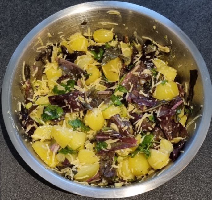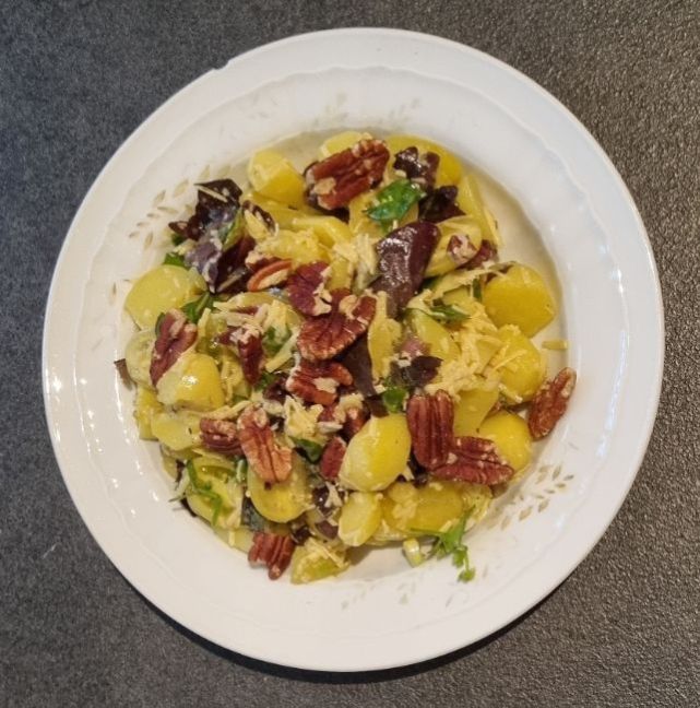 Krieltjessalade, gele tomaatjes en komijnekaas Ik heb dit recept gebruikt, maar andere hoeveelheden genomen, dat heb ik hieronder vermeld. Ik heb heel veel gele tomaten en eigenlijk ben ik niet zo zot op rouwe tomaat, mijn man wel. Maar als je 10 tomatenplanten hebt, dan moet je er toch wat mee doen niet waar? Vorige week had ik een gele tomatensoep gemaakt, ik vond het lekker, mijn man zei voor 1 keer. Dus vandaag weer iets geprobeerd en ja, dat vonden wij allebei erg lekker. En aangezien ik er ook een stuk zalm met knoflooksaus erbij had gedaan (kan niet zonder knoflook) werd het toch een beetje veel. Ik heb de hoeveelheden wat aangepast voor 2 personen. Ik zou zeggen: probeer het ook eens. Ik heb dit gebruikt: 🌱35 gr pecannoten 🌱425 gr krieltjes 🌱Sla, b.v. Romana of Salanova 🌱210 gr gele cherrytomaten 🌱2 bosuitjes 🌱2 el extra vierge olijfolie 🌱2 tl mosterd 🌱2 tl (witte) balsamico azijn 🌱1 tl honing 🌱Peper en zout 🌱1 Sinaasappel 🌱75 gr geraspte belegen of oude komijnekaas