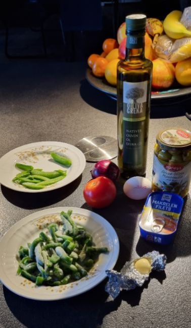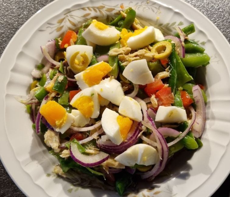 Salade Niçoise met makreel Een maaltijdsalade voor 2 personen. Nodig: 🌱2 eieren 🌱150 gram spekbonen of sperziebonen 🌱50 gram sugar snaps of peultjes 🌱1 kleine rode ui 🌱1 of 2 tomaten 🌱100 (gerookte) makreel 🌱75 gr olijven 🌱Wat kappertjes of stukjes ansjovis 🌱2 teentjes knoflook 🌱Olijfolie extra vierge Werkwijze: 🍜 Kook de eieren in 8 minuten en laat ze schrikken in koud water, pel ze dan en laat ze afkoelen. 🍜 Maak de bonen en de sugarsnaps schoon. 🍜 Kook de spek- of sperziebonen in ruim water. Voeg na 4 minuten de sugarsnaps erbij en laat het samen nog 4 minuten koken. Ik heb bonen uit de vriezer genomen en ze beiden 1 minuut korter gekookt. 🍜 Spoel de groenten na het afgieten af met koud water. 🍜 Snij de ui in dunne ringen en de tomaten in partjes. 🍜 Snijd de makreel in kleine stukjes. 🍜 Snijd de olijven in plakjes. 🍜 Doe alles in een grote kom. Doe wat olijfolie erbij en roer het goed door. 🍜 Verdeel de salade over de 2 borden. Snijd de eieren in partjes of vieren en verdeel deze over de salade. TIP: i.p.v. gerookte makreel kun je ook een blikje makreel nemen met wat gerookt zout. Of wat wij ook in Duitsland kunnen kopen is gerookte haring in blik. Vond je dit een lekker recept, dan zou ik het leuk vinden als je een reactie zou willen geven op de Facebook groep. Voor meer zelfverzonnen recepten ga dan naar deze groep (even lid worden). https://www.facebook.com/groups/lekkerengezondkokenmetpetra