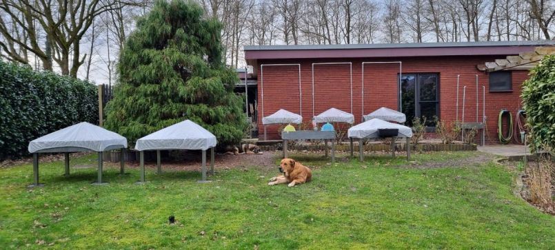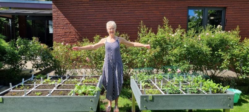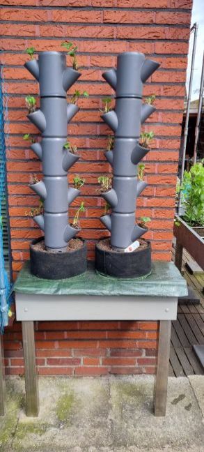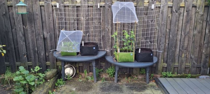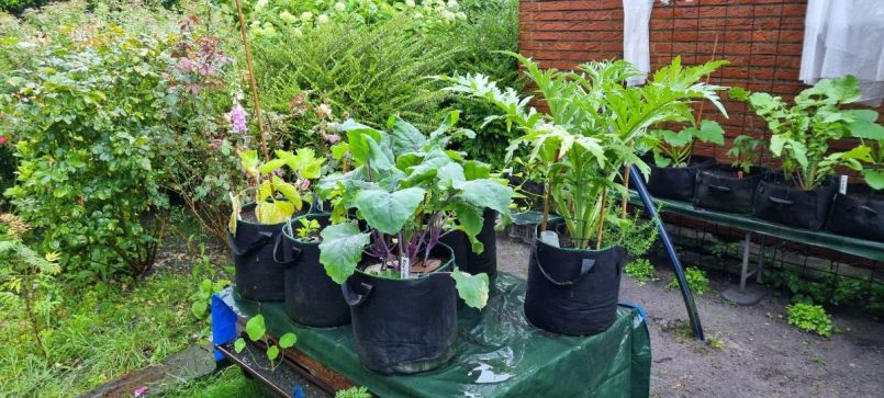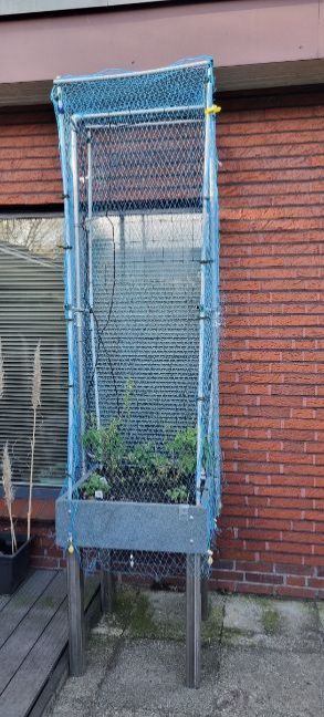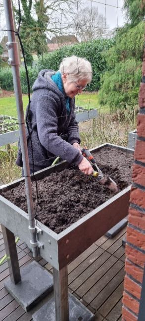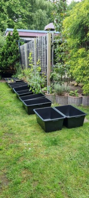 16. Ik ben 30 juli 2023 voor het eerst begonnen met mijn moestuin. Ik had 2 grote tafels op poten besteld, met een aantal groentezakken met aarde en gewoon begonnen. Nog geen half jaar later heb ik er 7 tafels bijbesteld en ook nog diverse groentezakken. Altijd kom je tekort en weer een paar maanden later nog een aantal grote groentezakken besteld, want ik kreeg pallets van een buurvrouwtje en daarop kwamen dan weer de zakken te staan. En toen besloot ik 2 maanden terug om ook wat speciebakken te nemen en daar de wat diepere groente te zaaien of tenminste de groente die meer in de diepte kunnen de vrijheid te geven. Die zijn dan wel weer bevattelijker voor slakken, dus morgen kome er bogen, het doek heb ik al en dan ga ik kijken of ik er iets van kan maken. Want ik wil graag diverse kolen zaaien (al gedaan intussen) maar voorkomen dat ze opgegeten worden door slakken en rupsen. Elke avond vanaf begin april gaan mijn man en ik de tuin in en rapen gemiddeld 200 slakken op. Daarna zijn wij allebei kapot, want wij liggen elke avond om 00.30 - 0.100 uur in bed en soms later. En normaal gaan wij veel vroeger naar bed, dus dit moet niet langer duren. Sommige fotos blijven op hun kop staan, ook al heb ik ze omgedraaid en opgeslagen.