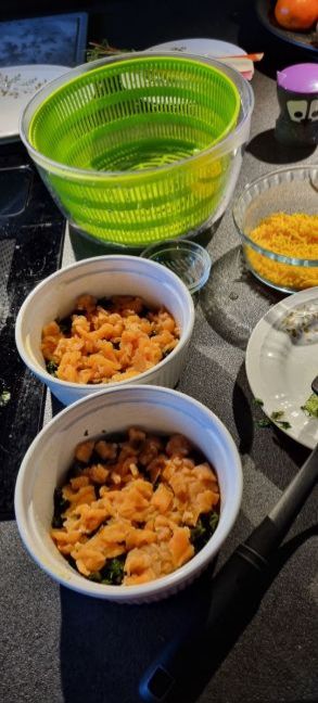 13. Ovenschotel spinazie met zalm Nodig voor 2 personen: 🌱4 kleine aardappelen 🌱1 pakje room 200 ml 🌱gerookte zalm 150 gr 🌱1 el mosterd 🌱300 gr spinazie (ik heb 200 gr NZ spinazie en 100 gr snijbiet genomen) 🌱1 el olijfolie 🌱75 gr gratinkaas 🌱2 ovenschaaltjes ingevet 🌱peper, zout en nootmuskaat 🌱olijfolie 🍜Kook de aardappels in 20 minuten gaar en stamp ze fijn. Roer er 75 ml room doorheen. 🍜Verwarm de oven op 250 graden. 🍜Was de spinazie grondig. Van de snijbiet gebruik je alleen het blad en snijd dat in kleinere stukken. 🍜Roerbak de spinazie in wat olijfolie in de wok of grote koekenpan. 🍜Roer wat peper, zout en nootmuskaat door de spinazie. Eventueel snijd je het nog wat fijner. 🍜Maak een sausje van 125 ml room, de mosterd en wat peper en zout. 🍜Snijd de zalm in kleine stukjes. 🍜Leg de spinazie onderin het schaaltje, doe daarop de zalm, de aardappelpuree, de room en als laatste de gratinkaas en zet het ongeveer 5 - 10 minuten in de oven totdat de kaas bruin verkleurt. Vond je dit een lekker recept, dan zou ik het leuk vinden als je een reactie zou willen geven op de Facebook groep. Voor meer zelfverzonnen recepten ga dan naar deze groep (even lid worden). https://www.facebook.com/groups/lekkerengezondkokenmetpetra