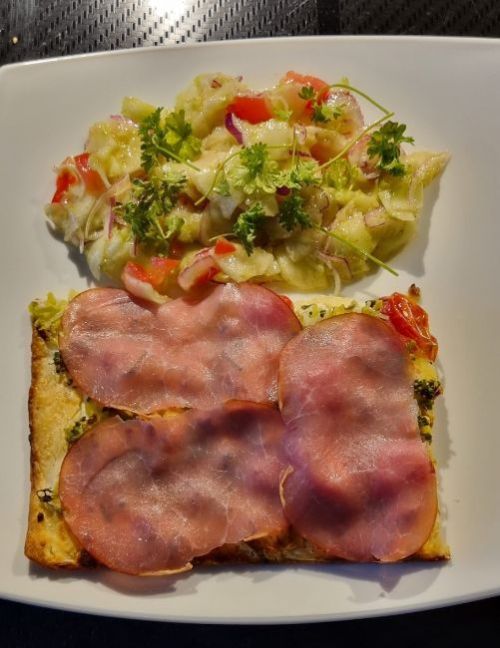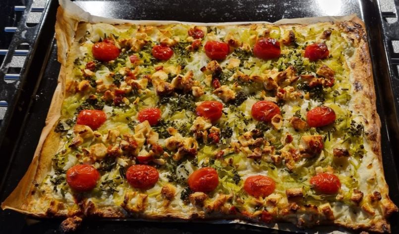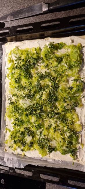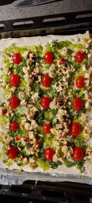 11. Flammkuchen met prei en broccoli Nodig voor 3 a 4 personen: 🌱 2 el olijfolie 🌱 1 rol flammkuchendeeg 🌱 1 kleine prei 🌱 Stelen en roosjes babybroccoli 🌱 8 kerstomaatjes 🌱 200 gr Philadelphia 🌱 3 tenen knoflook uitgeperst 🌱 100 gr gerookte ham 🌱 Feta kaas naar behoefte, eventueel klein gesneden Werkwijze: 🍜 Verwarm de oven voor op 200 graden boven- en onderwarmte. 🍜 Snijd de prei in halve ringen (eventueel kook je die 3 minuten voor) 🍜 Snijd de tomaatjes in helften. 🍜 Maak de broccoli schoon en snijd de stelen in stukjes. 🍜 Pers de knoflook uit en vermeng die met de Philadelphia. 🍜 Rol het deeg uit en besmeer die met de Philadelphia. 🍜 Leg de prei en de broccoli verdeeld erop. 🍜 Plaats de tomaatjes verdeeld erop. 🍜 Als laatste verdeel je de Feta, ik heb ze tussen de rijtjes van de tomaten verspreid. 🍜 Laat de plaat in zo’n 10 - 15 minuten goudbruin bakken. 🍜 Haal de plaat uit de oven en beleg deze met de gerookte ham. Lekker met zoetzure komkommer. Vond je dit een lekker recept, dan zou ik het leuk vinden als je een reactie zou willen geven op de Facebook groep. Voor meer zelfverzonnen recepten ga dan naar deze groep (even lid worden). https://www.facebook.com/groups/lekkerengezondkokenmetpetra