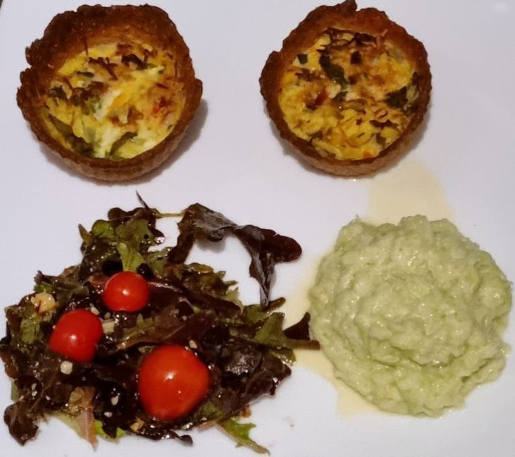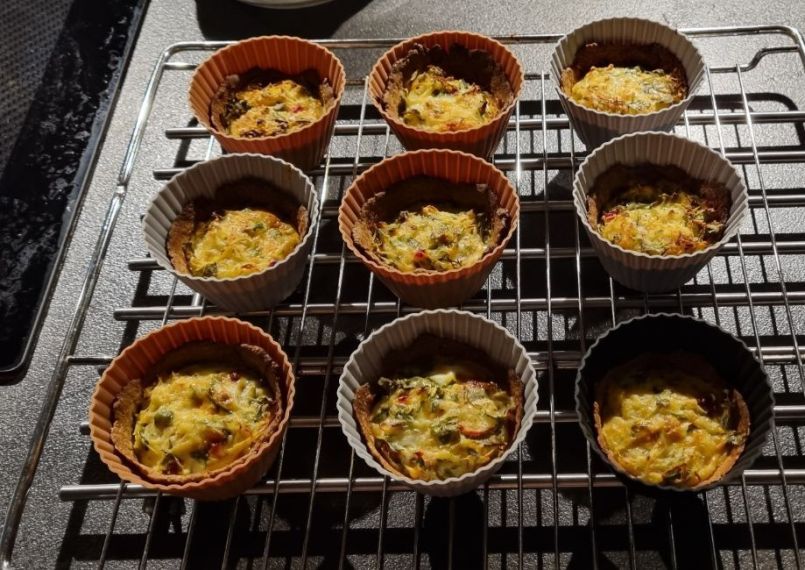 5. Mini quiches met aardappel Nodig: 🌱150 gr spelt volkoren meel 🌱1 tl bakpoeder 🌱80 gr magere kwark 🌱2 el havermelk 🌱3 el olijfolie 🌱Beetje zout en suiker 🌱250 gr fijn geraspte aardappel 🌱50 gr verse klein gesneden groente uit de tuin Ik had nu: 1 spekboon 1 kleine biet 1 kleine wortel wortelgroen bietenblad 🌱1 lente-uitjes of sjalotjes 🌱40 gr Emmentaler of Leerdammer geraspt 🌱2 eieren 🌱100 ml slagroom 🌱Zout, peper en nootmuskaat 🌱9 of 10 muffin vormpjes Werkwijze: 🍜Kook de groente een paar minuten voor. 🍜Vermeng de meel met de bakpoeder in een kom. Voeg de kwark, havermelk, olie, zout en suiker toe en kneed dit tot een deeg. 🍜In een andere kom vermeng je de aardappel, groente, bosuitjes of sjalotjes en de kaas. 🍜In een 3e kom vermeng je de eieren, slagroom, zout, peper en nootmuskaat. 🍜Bekleed de muffin vormen met het deeg. 🍜Doe dan de groentevulling in de vormpjes. 🍜Als laatste verdeel je het eimengsel, ± 2 el per muffin. 🍜Bak de muffins in 30 minuten op 175 graden. Lekker met Tzatziki van komkommer, knoflook, mayo en cayennepeper en een zachte salade met tomaatjes. (ook uit de tuin) Vond je dit een lekker recept, dan zou ik het leuk vinden als je een reactie zou willen geven op de Facebook groep. Voor meer zelfverzonnen recepten ga dan naar deze groep (even lid worden). https://www.facebook.com/groups/lekkerengezondkokenmetpetra