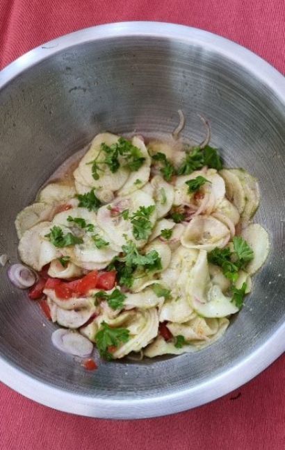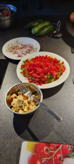 7. Gemarineerde komkommer met tomaat Nodig voor 3 a 4 personen: 🌱1 middelmatige komkommer, heel dun gesneden 🌱1 rode ui, dun gesneden 🌱1 tomaat, in stukjes of stukken gesneden 🌱15 ml appelazijn 🌱15 ml olijfolie 🌱1 el honing 🌱½ el mosterd 🌱mespunt zout 🌱mespunt zwarte peper 🌱1 el verse peterselie geknipt Werkwijze: 🍜Mix in een grote kom de gesneden komkommers, rode ui en tomaat. Ik heb gisteren de komkommer in vieren gesneden en toen in plakjes. Mijn man houdt niet zo van komkommer, alleen als het heel klein gesneden is. 🍜Mix in een andere kleine kom de appelazijn, olijfolie, honing, mosterd, zout en peper. 🍜Voeg de dressing over de groenten in de grote kom en schep het goed om. 🍜et de schaal in de koelkast weg met een stuk plastic folie erop. Laat het minstens 2 uur, of beter een hele nacht in de koelkast staan. 🍜Voor het opdienen voeg je de verse peterselie toe op de groente. Zorg wel dat het goed koud is. Vond je dit een lekker recept, dan zou ik het leuk vinden als je een reactie zou willen geven op de Facebook groep. Voor meer zelfverzonnen recepten ga dan naar deze groep (even lid worden). https://www.facebook.com/groups/lekkerengezondkokenmetpetra