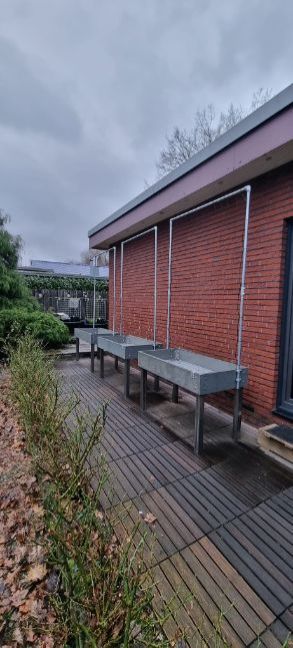 6. Hoe lang blijft de tape zitten denk je? Na 1 regenbui is het weg. En het regent vaak bij ons. En bij die speciebakken daar had ik al groente inzitten en later gordijnen en beugels in gemaakt.