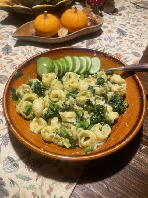 Ik at allen en dat is dan precies goed moment om de broccolischeuten te verwerken 😊 Door de tortelini kaas deze keer en met schepje groene pesto . Een snackkommertje erbij ; lekker en lekker makkelijk 😋😊🌱👩🍳🌱🐓🌱🎃🌱