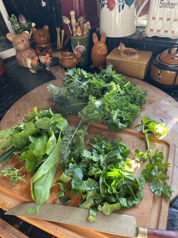 Ik heb blad van de maai boerenkool geoogst… ze gaat een bloemknop vormen….dus laatste bladoifst denk ik. Wat reuze spinazieblad geoogst en diverse soorten tuinkruiden voor in de frittata 😋🌱👩🍳🌱🐣🌱🌷🌱