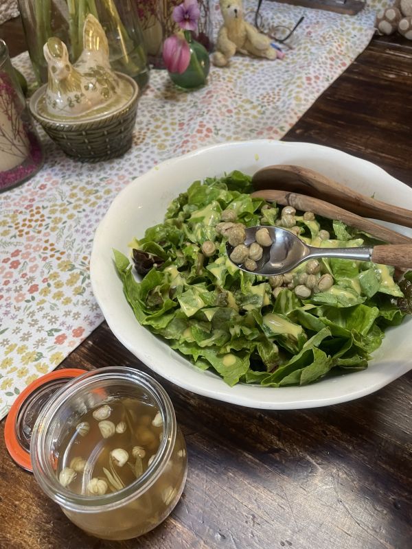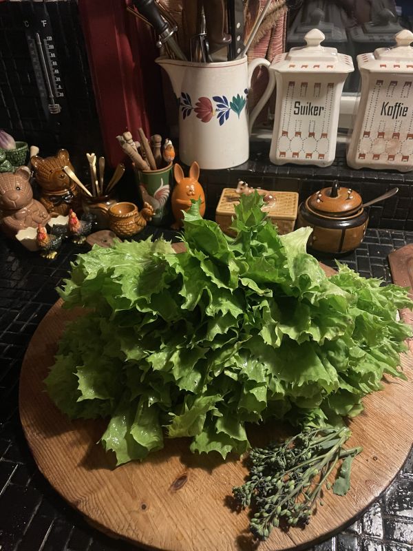 Gister weer 1 vak andijvie geoogst .. nu de temp oplooot moeten ze er allemaal uit want ze gaan doorschieten zie ik…😬 Sharon de kok bij tv programma binneste buiten deed zongedroogde tomaatjes en walnoten door de stamp andijvie dat ga ik vandaag ook eens proberen 😋 Ik ging om portie sla te oogsten en viel mijn oog op nog potje zelf ingemaakte o.i. kers kappertje die erdoor gedaan met hongmosterd dressing snel klaar en heerlijk 😋🌱👩🍳🌱🐣🌱🌷🌱