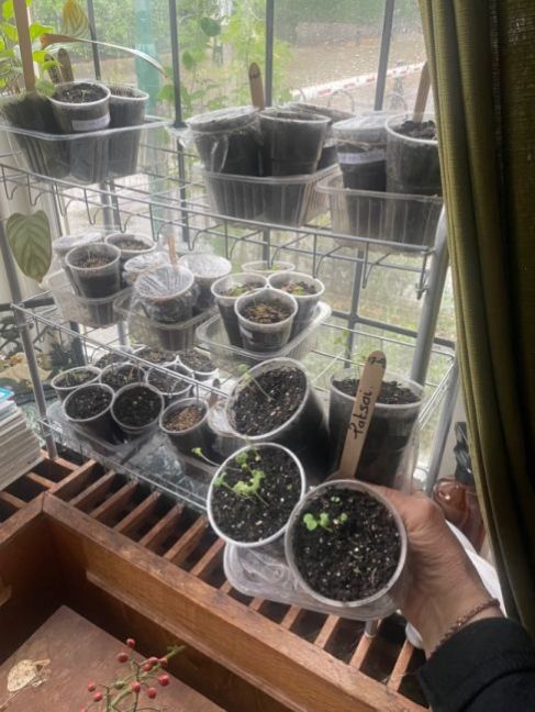 Vandaag onder mijn afdak raapsteeltjes in een vak gezaaid. op mijn zon slaapkamerbalkon de sweetie tomaat eruit en voorgekiemde Calibra doperwtjes erin.. deels voor de scheuten en midden bij klimnet laat ik groeien voor de erwten dan zijn ze hopelijk oogstbaar voordat in juni de tomaten weer op die plek komen….;kleding rek waar ik een klimnet in heb gespannen 👍😊