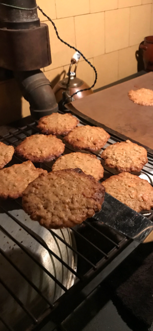 Ik bak al jaren haverkoeken die mijn kids dan mee naar school namen… basis recept; 60gr bloem+ 60gr volkorenmeel 1/2 tlp backing soda 1/2 tlp bakpoeder 1/2tlp zout 125 gr bruine basterd suiker 125 gr boter 1 ei los geklopt 1 tlp vanille ecc 1 elp melk 1/2 tlp sinaasappelrasp 160 gr havervlokken 125 gr gedroogde cranberry’s soms voeg ik lijnzaad of sesamzaad of gehakte noten of rozijnen of stukjes chocolade…. Sinds laatste 2 jaar verdeel ik het deeg over de bakplaat en verkruimel het na het goed krokant bakken.. in stukken als granola…😋😋😋 wij doen nu mee aan de yoghurt ontbijt trend en eten die zelf made granola in de Griekse yoghurt met bosbessen😋😋😋 foto uit de oude doos toen ik de granola nog al koeken bakte 😋