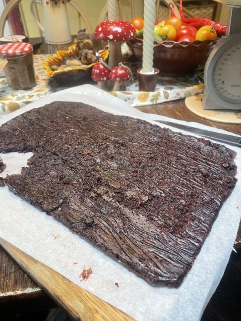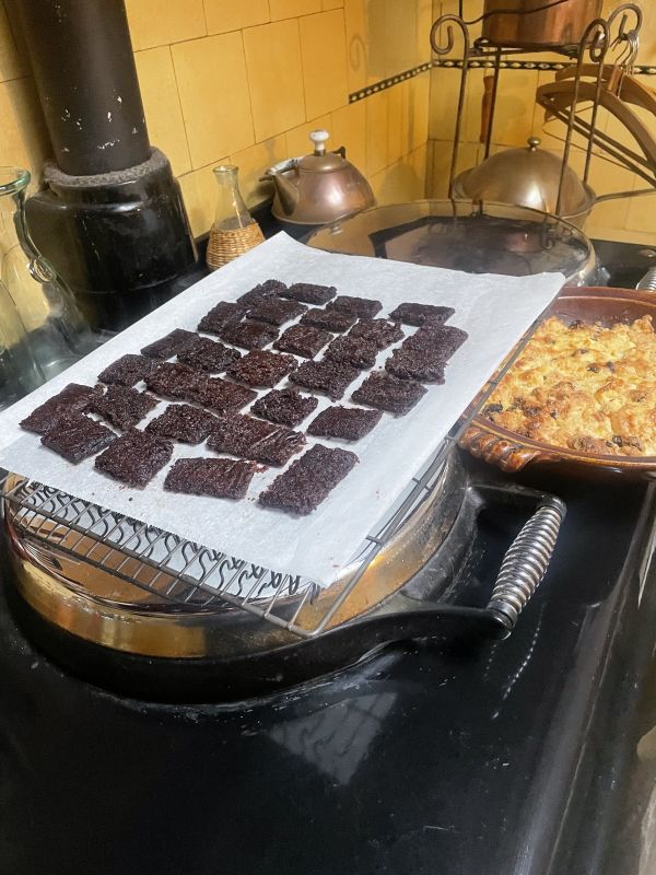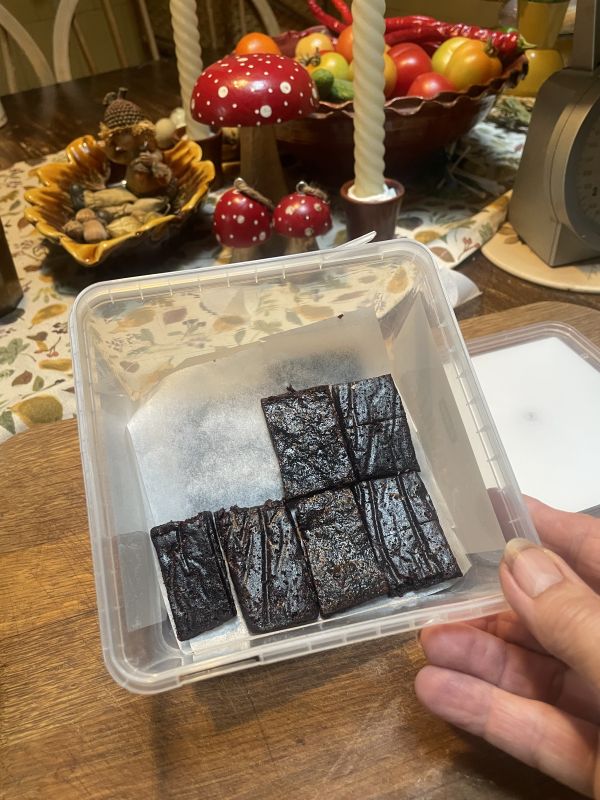 24. Vanmorgen mijn bakblik met kweeperen moes onderuit de AGA gehaald…oeps 😬 toch wat te lang een hele nacht…want erg donker… maar de smaak is prima … 😋 Toen het wat afgekoeld maar nog wel warm het blik omgedraaid boven snijplank met schoon vel bak papier en de nu boven liggende laag er voorzichtig afgehaald…. Helaas zat het langs de randen muur vast dus die heb ik er deels afgesneden/geknipt…😏 De volgende hoeveelheid doe ik op siliconen vel en tussen de middag erin zodat ik beter de tijd in de gaten kan houden…👍😊🌱👩‍🍳🌱🐓🌱🎃🌱 Hoek eraf komt omdat iedereen ff wilde proeven..😅 pfff dat snijden ging nog niet makkelijk…doordat het zo kleverig is… het middenstuk vind ik nog te zacht aan de onderkant dus nu de onderkant boven en laat ik ze zo bovenop (40 gr) nog tijd wat steviger worden…😊 Deel van de blokjes die al goed zijn in bakje met bakpapier ertussen in de koelkast…👍😊 Nu hopen dat de volgende lading mooier van kleur word🤞🤞🤞🌱👩‍🍳🌱🐓🌱🎃🌱