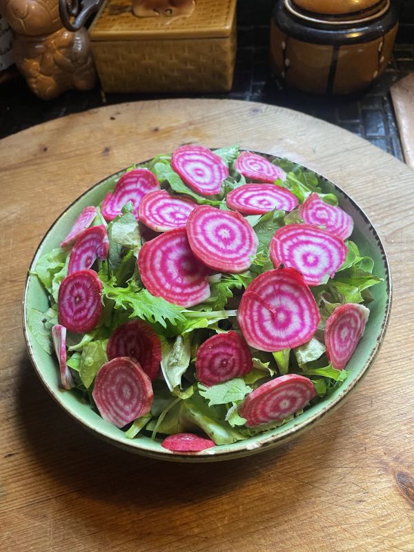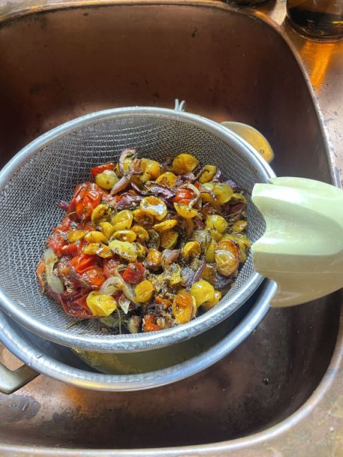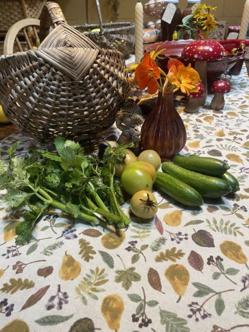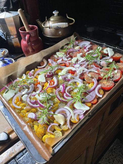 19. Oudste zoon met vriendin aten mee…dus grote schaal tomaten uet ectr geroosterd en met staafmixer in zeef geblend tot pasta saus 😋 Erbij; gebakken ui en courgette en salade mix blaadjes uet met plakjes van mijn enige gelukte biet… 😊uet Zag er wel mooi uit zo en die biet is rauw in dunne plakjes heerlijk😋 Koffie met appelcake van eigen appeltjes met zelf gemaakte advocaat erover toe! 😋 Ik trots dat alles uet en zelf gemaakt was…😍 Zegt mijn lief heel droog…” ik heb heel de middag wokkel pasta zitten draaien!!”…….😂🌱👩‍🍳🌱🐓🌱🎃🌱